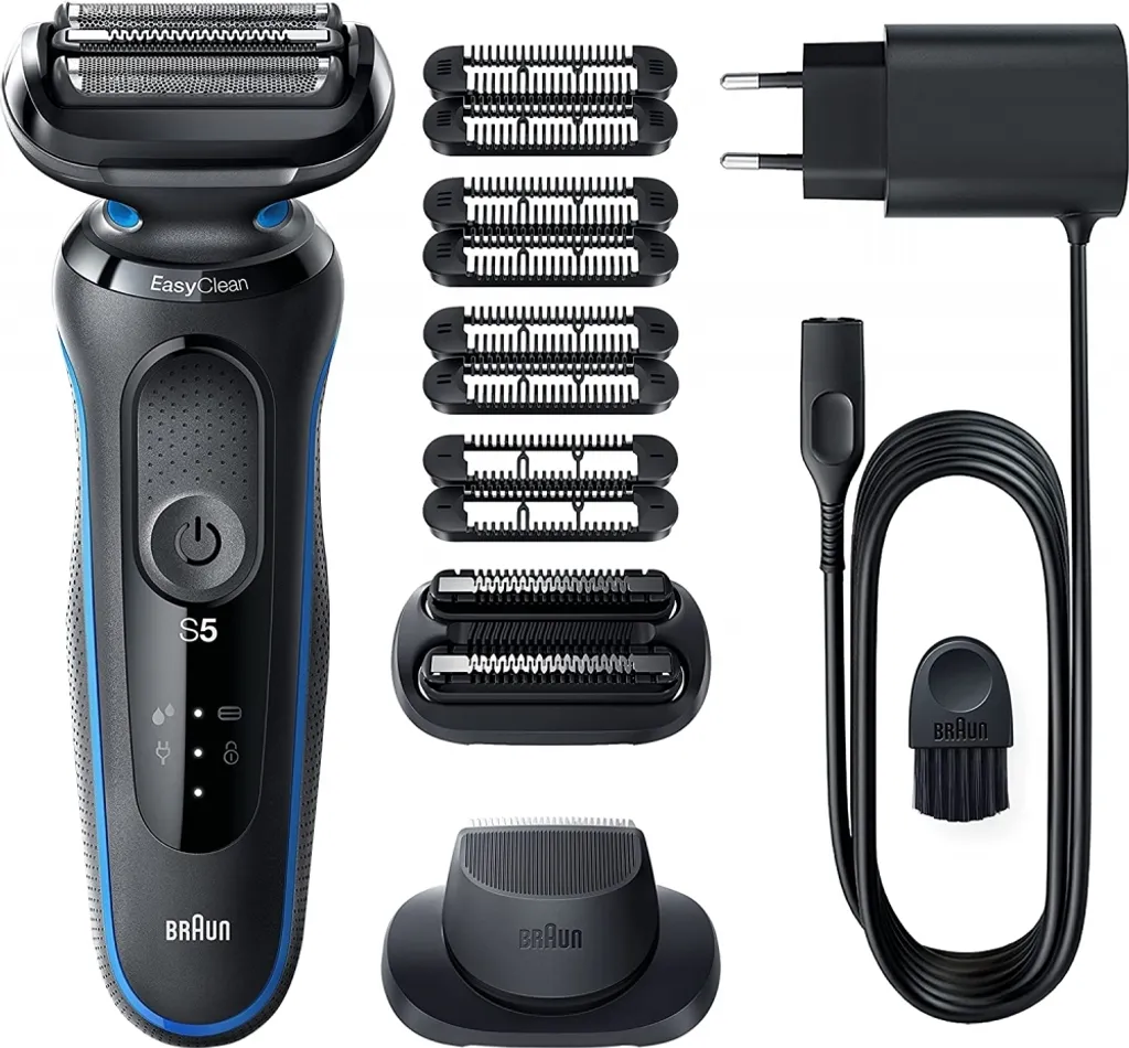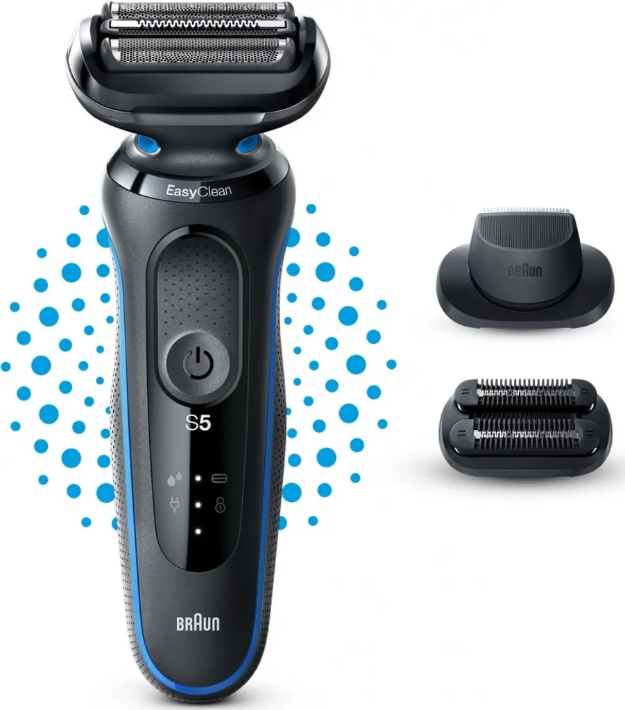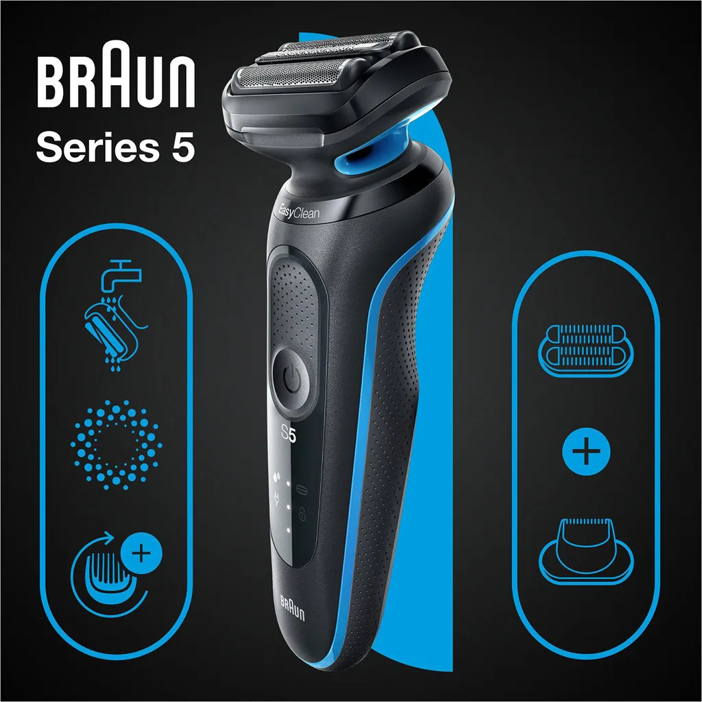Der Braun Series 5 Elektrorasierer für Männer ermöglicht eine einfache Rasur mit 3 flexiblen Klingen, die sich an Ihre Gesichtskonturen anpassen. Das EasyClean-System bietet eine schnelle und einfache Reinigung, ohne Abnahme des Scherkopfs. Der Lithium-Ionen-Akku hat eine Laufzeit von bis zu 3 Wochen und eine Schnellladung von 5 Minuten, die für eine Anwendung reicht. Dieser elektrische Rasierer für Herren ist 100% wasserdicht und für die Nass- und Trockenrasur geeignet. Kompatibel mit EasyClick für zusätzliche Funktionen Ihres Rasierers. Im Lieferumfang enthalten: 1x Series 5 Elektrorasierer für Herren 1x Präzisionstrimmer-Aufsatz 1x 3-Tage-Bart-Trimmer-Aufsatz 1x Schutzkappe 1x Netzteil mit automatischer Anpassung an 100 V bis 240 V 1x Reinigungsbürste