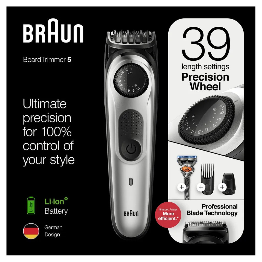 - Braun Barttrimmer sind für eine 2x längere Lebensdauer entwickelt (im Vergleich zu vorherigen Braun Barttrimmern). Besonders geeignet für 3- bis 5-Tage-Bärte oder längere Bärte