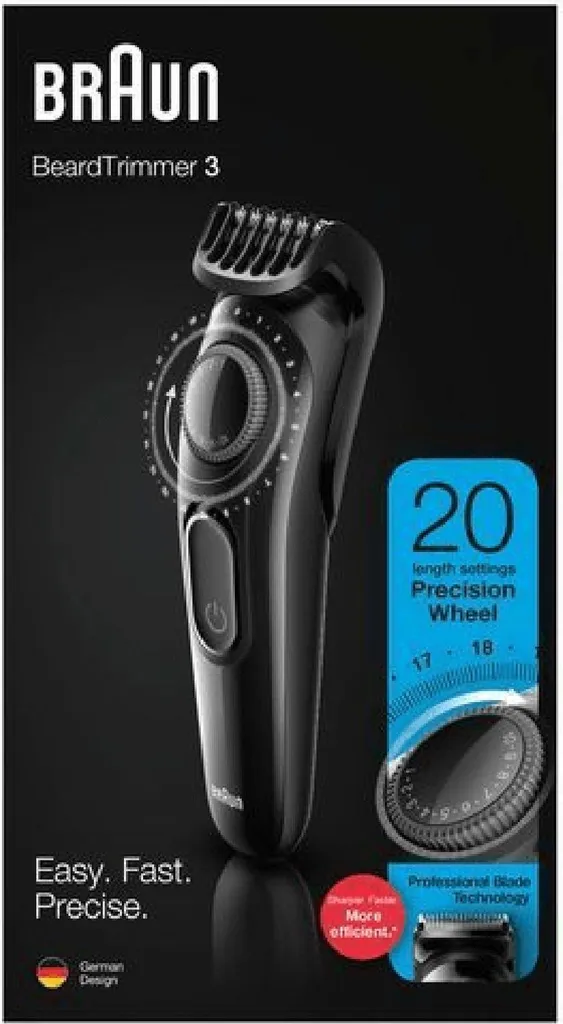 Reibungsloses Stylen mit dem Braun BT3222 Barttrimmer und Haarschneider für Herren. Der Barttrimmer BT3222 bietet ultimative Präzision für einen geraden Schnitt. Er verfügt über ein Präzisionsrad mit 20 Längeneinstellungen und ist mit lebenslang scharfen Klingen ausgestattet. Der Trimmerkopf und Kammaufsatz sind abwaschbar (das Gerät sollte nicht unter Wasser gehalten werden).