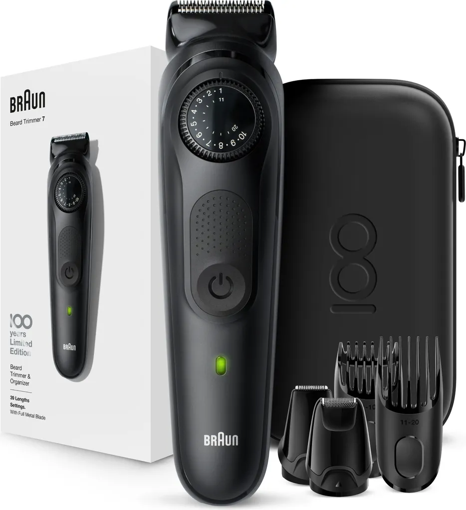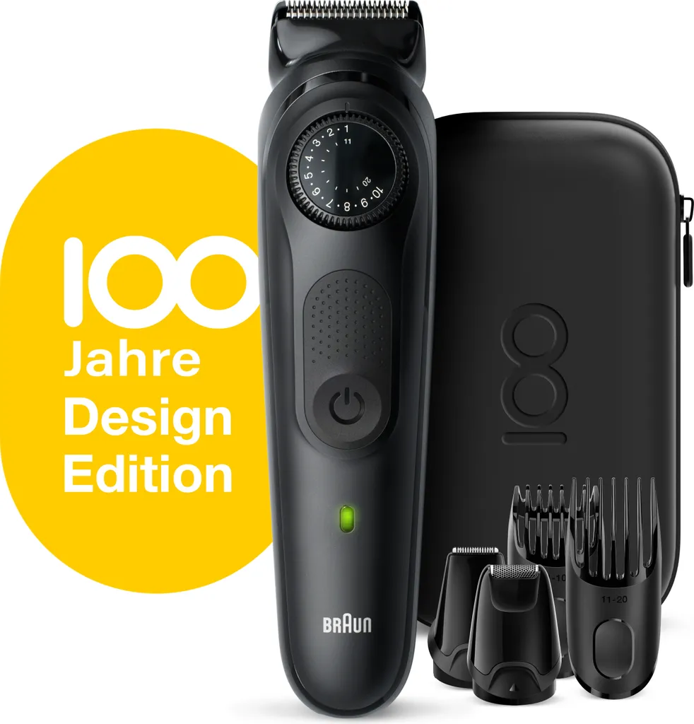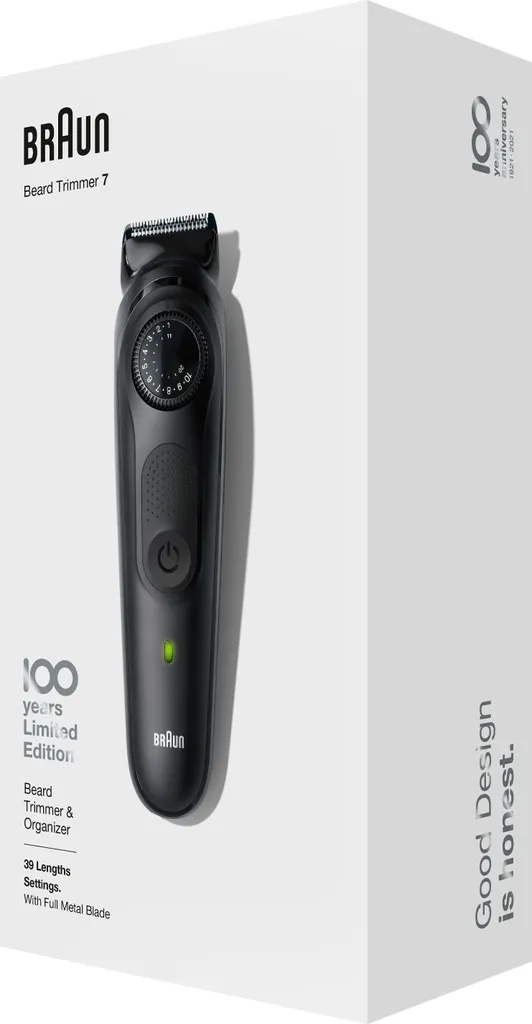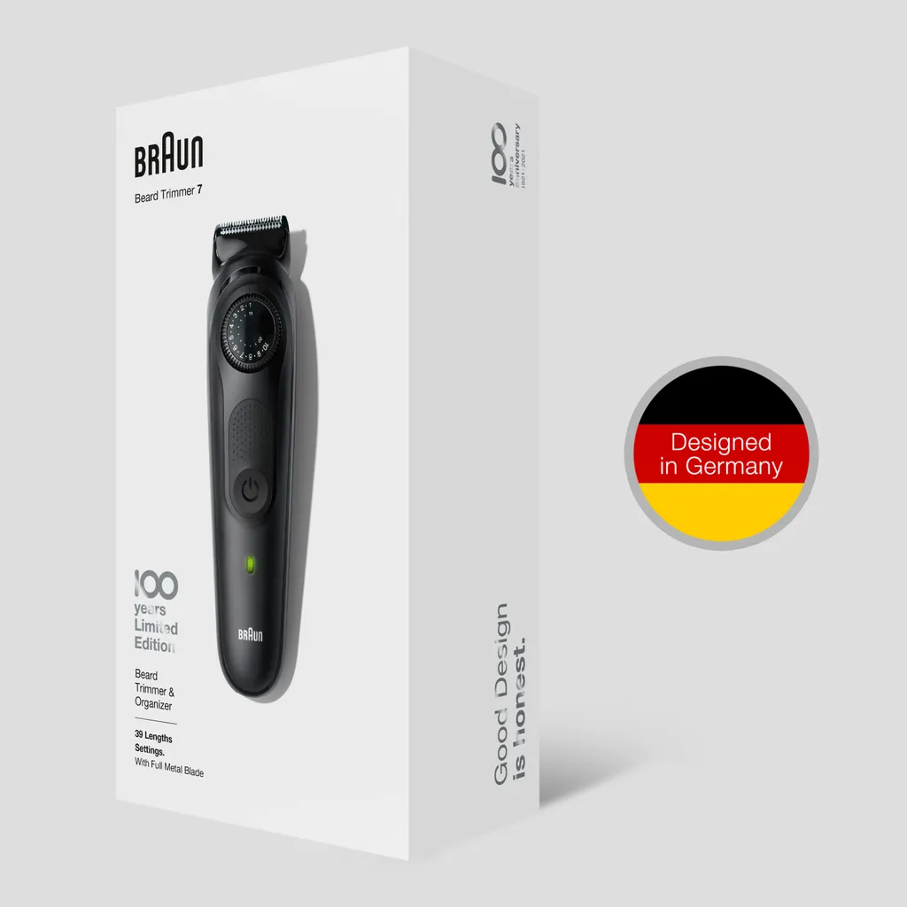Um das 100-jährige Jubiläum von Braun zu feiern, haben wir spezielle Editionen für einige unserer führenden Produkte zusammengestellt, darunter unser präzisester Bart- und Haartrimmer für Herren: der Barttrimmer 7. Dieser Barttrimmer und Haarschneider für Herren verkörpert die Philosophie von Braun: Gutes Design hat Priorität. Präzisionsrad mit 39 Längeneinstellungen. Die lebenslang scharfen Klingen rasieren und trimmen Stoppeln und Barthaare in professioneller Qualität. Der AutoSensing-Motor passt sich selbst dem dichtesten Bartwuchs an. Intuitiv. Nützlich. Langlebig. Im Lieferumfang enthalten: 1x Trimmer 1x Design Edition Reise-Etui 1x Kammaufsatz für 1–10 mm 1x Kammaufsatz für 11–20 mm 1x Detail-Trimmer 1x Mini-Präzisionsscherkopf 1x Reinigungsbürste*Prüfen Sie die teilnahmeberechtigten Länder und registrieren Sie sich auf Braun.de oder scannen Sie den QR-Code auf der Verpackung