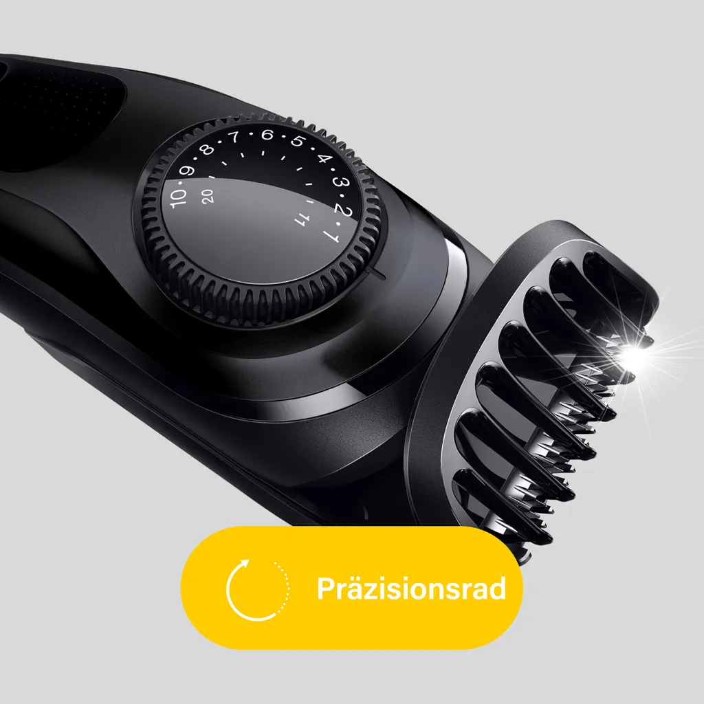 - Erreichen Sie mit den verschiebbaren Bart- und Haartrimmer-Kammaufsätzen Bartlängen zwischen 0,5 und 20 mm