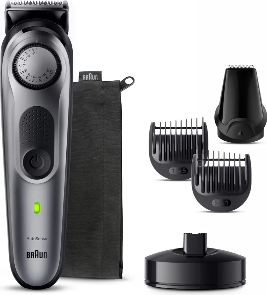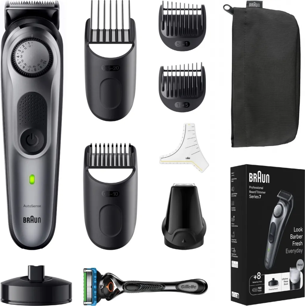 Für einen Barber Fresh Look zu Hause: Braun Professional Series 7 Barttrimmer. Präzise bei jedem Zug mit unserer schärfsten Pro-Klinge. Die AutoSense-Technologie sorgt für Gleichmäßigkeit bei jedem Bart. ProWheel mit 40 Längeneinstellungen, 100 Min. Akkulaufzeit.Im Lieferumfang enthalten:1x Barttrimmer inkl. Pro-Klinge-Trimmeraufsatz 1x Detail-Trimmerkopf 1x Präzisions-Kammaufsatz (0,5–10 mm) 1x Präzisions-Haar-Kammaufsatz (10,5–20 mm) 1x Bartkammaufsatz für Übergänge 1x Gillette ProGlide Rasierer 1x Gillette ProGlide Ersatzklinge 1x Ladestation 1x Bartschablone 1x Reinigungsbürste 1x Aufbewahrungstasche mit Reißverschluss