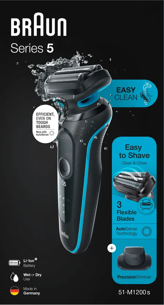 Der Braun Series 5 51-M1200s Rasierer verfügt über drei flexible Rasierelemente, die sich an die Gesichtskonturen anpassen – für eine gründliche und einfache Rasur. Der Scherkopf verfügt außerdem über das EasyClean-System, welches eine schnelle und einfache Reinigung ohne Abnahme des Scherkopfs ermöglicht. Durch das EasyClick-System kann der Rasierer mit einem einfachen Klick umgerüstet werden. Die Aufsätze für verschiedene Pflegebedürfnisse können leicht ausgetauscht werden. Im Lieferumfang enthalten ist ein EasyClick Präzisionstrimmer-Aufsatz für das Trimmen von Schnurrbart und Koteletten. Der integrierte Lithium-Ionen-Akku ermöglicht ein Rasieren von bis zu drei Wochen (50 Minuten Akkulaufzeit) und eine fünfminütige Schnellladung, die für eine Anwendung reicht. Der Braun Series 5 ist dank Wet&Dry Technologie 100% wasserdicht und für die Nass- und Trockenrasur geeignet. Auch die Verwendung mit Schaum oder Gel stellt kein Problem dar.