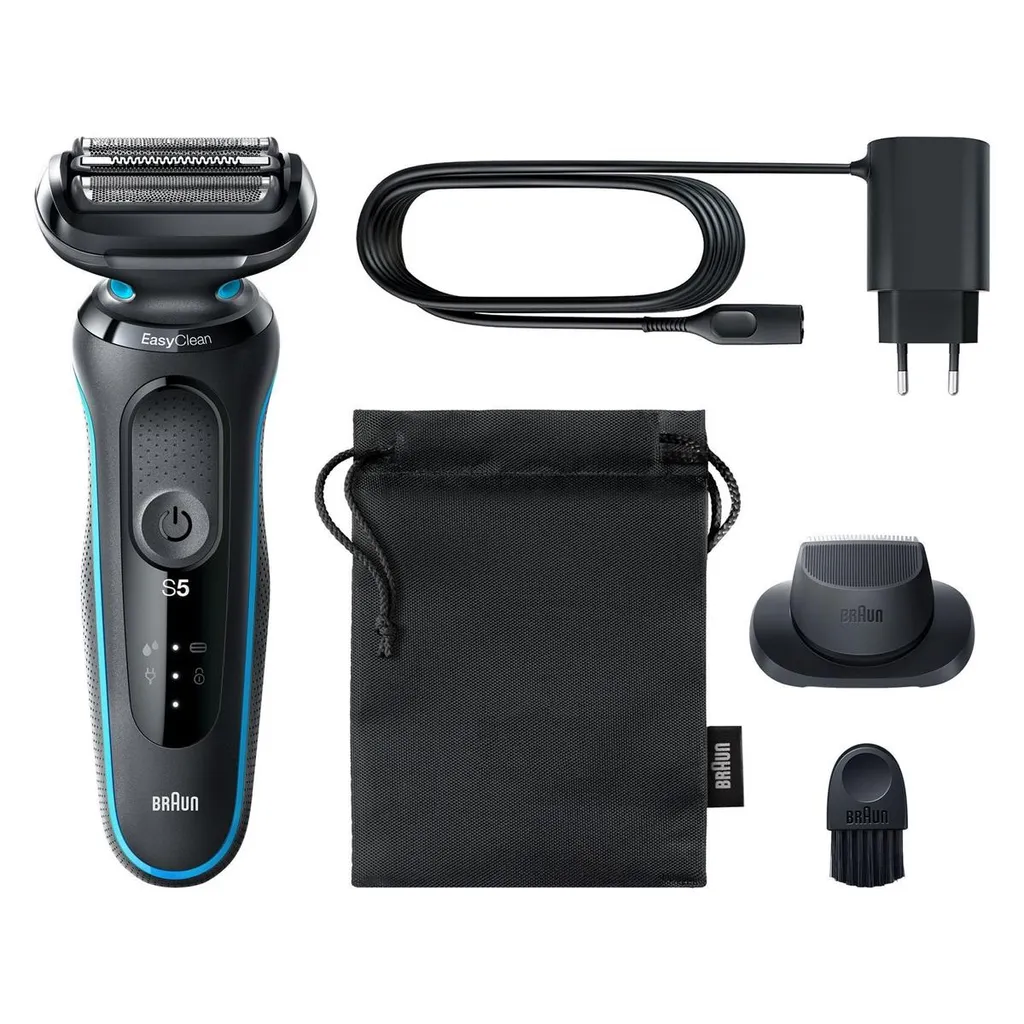 Der Braun Series 5 Elektrorasierer für Männer ermöglicht eine einfache Rasur mit 3 flexiblen Klingen, die sich an Ihre Gesichtskonturen anpassen. Das EasyClean-System bietet eine schnelle und einfache Reinigung, ohne Abnahme des Scherkopfs.