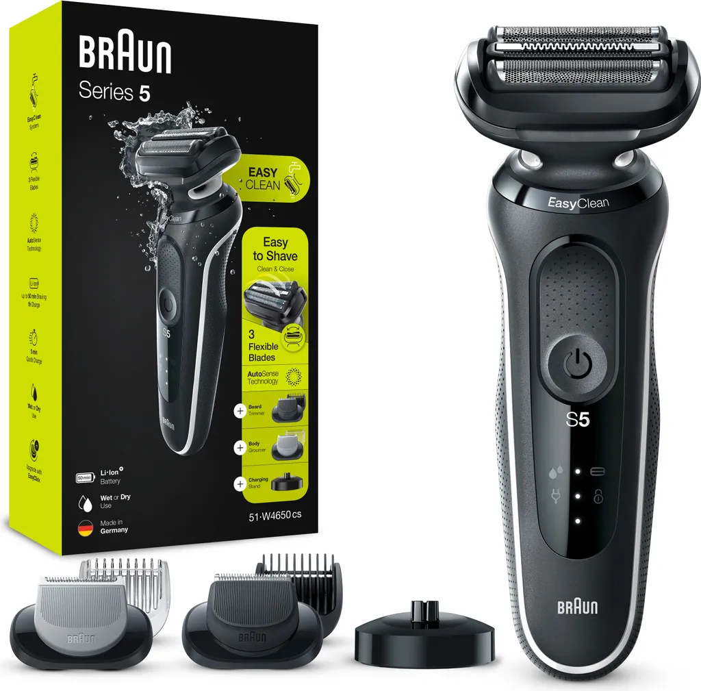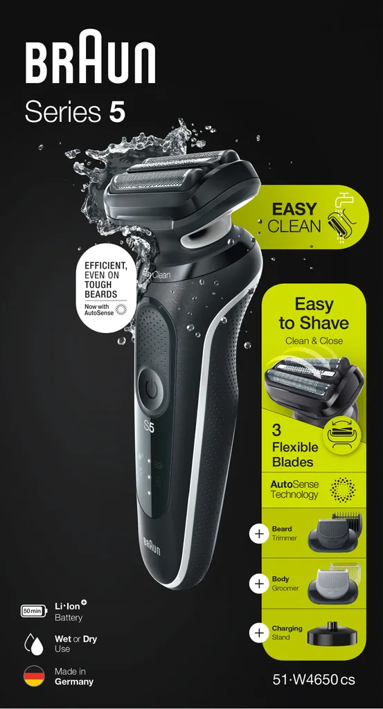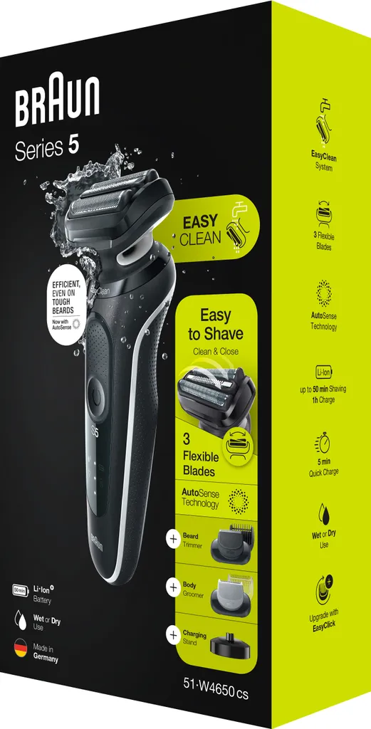 Der Braun Series 5 51-W4650cs Rasierer verfügt über drei flexible Rasierelemente, die sich an die Gesichtskonturen anpassen – für eine gründliche und einfache Rasur. Der Scherkopf verfügt außerdem über das EasyClean-System, welches eine schnelle und einfache Reinigung ohne Abnahme des Scherkopfs ermöglicht. Durch das EasyClick-System kann der Rasierer mit einem einfachen Klick umgerüstet werden. Die Aufsätze für verschiedene Pflegebedürfnisse können leicht ausgetauscht werden. Im Lieferumfang enthalten sind ein EasyClick Barttrimmer-Aufsatz für das Trimmen von Bärten von 0,5 bis 7 mm und ein Bodygroomer-Aufsatz für die Ganzkörperpflege. Der integrierte Lithium-Ionen-Akku ermöglicht ein Rasieren von bis zu drei Wochen (50 Minuten Akkulaufzeit) und eine fünfminütige Schnellladung, die für eine Anwendung reicht. Der Braun Series 5 ist dank Wet&Dry Technologie 100% wasserdicht und für die Nass- und Trockenrasur geeignet. Auch die Verwendung mit Schaum oder Gel stellt kein Problem dar.