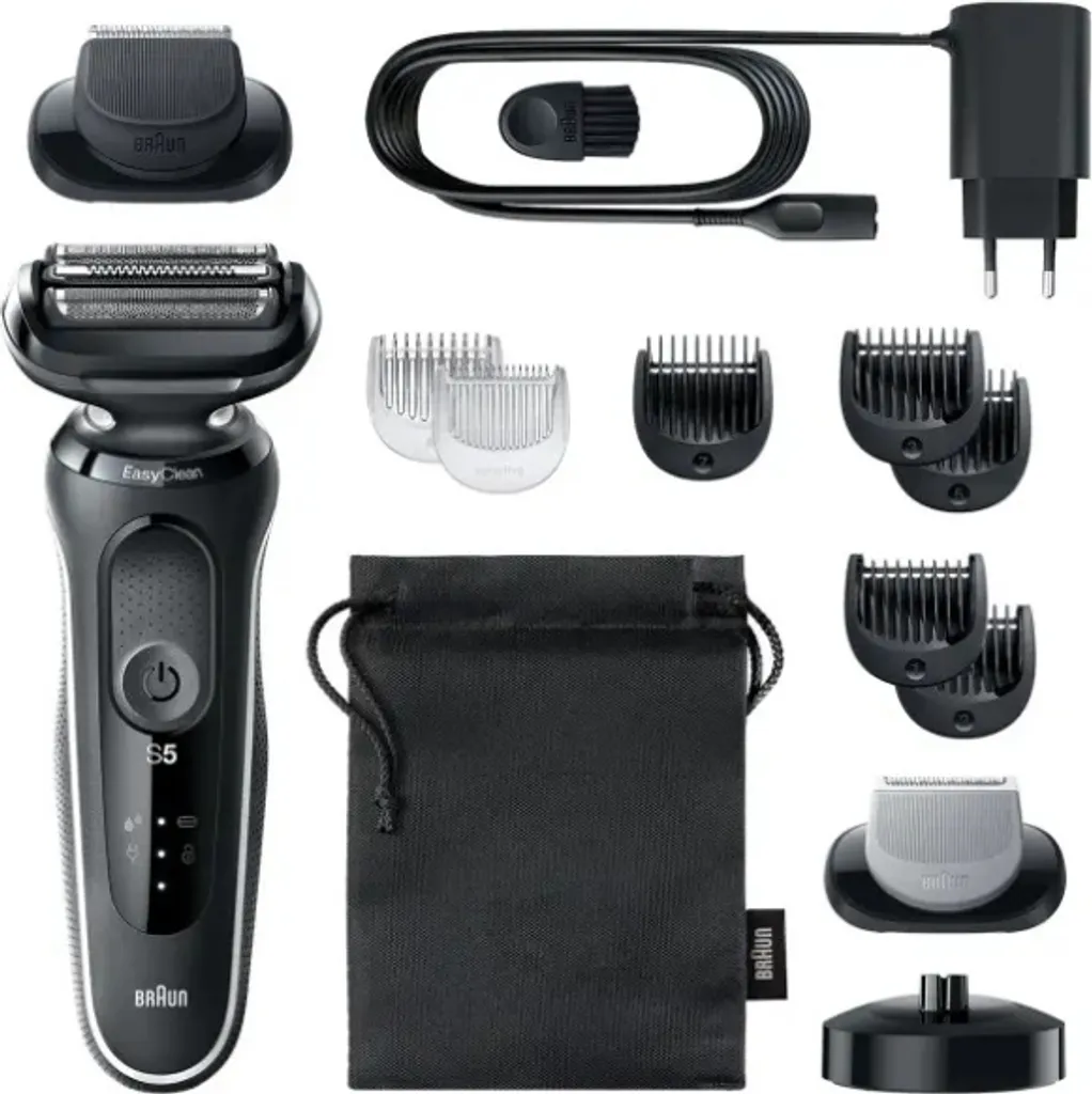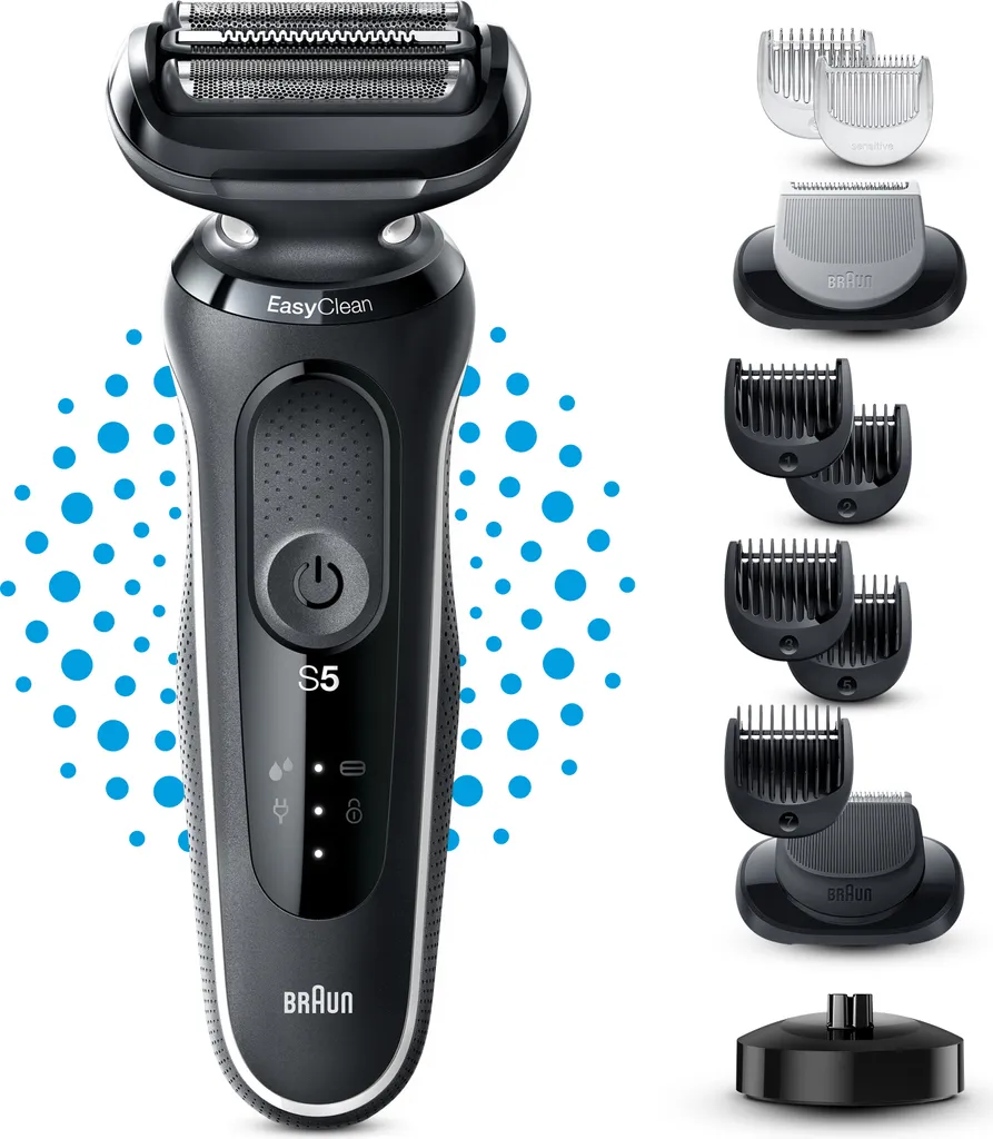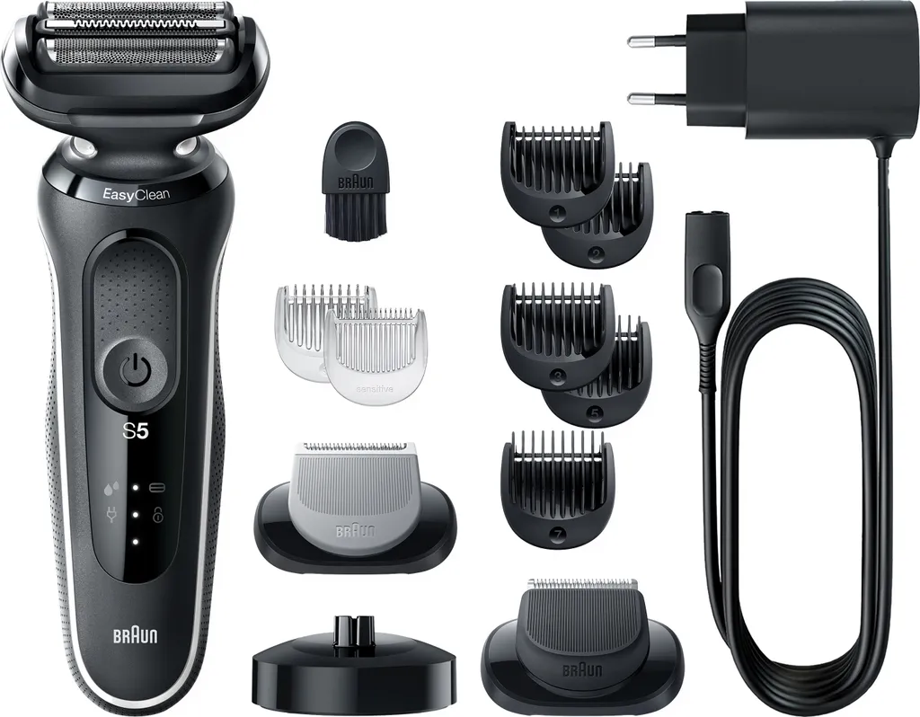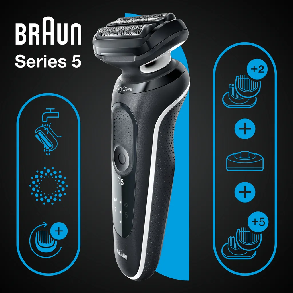 Der Braun Series 5 Elektrorasierer für Männer ermöglicht eine einfache Rasur mit 3 flexiblen Klingen, die sich an Ihre Gesichtskonturen anpassen. Das EasyClean-System bietet eine schnelle und einfache Reinigung, ohne Abnahme des Scherkopfs.