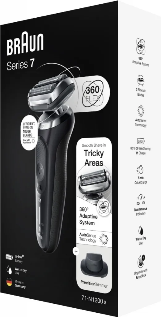 Wichtiger Hinweis: Beachten Sie, dass elektrotechnische Arbeiten nur durch Elektrofachkräfte oder unter deren Leitung und Aufsicht ausgeführt werden dürfen. Beachten Sie ggf. abweichende länderspezifische Normen und Vorschriften der Elektroinstallation und lassen Sie sich durch einen örtlichen Elektroinstallateur beraten. Geräte mit einem Anschlusswert > 380V/400V benötigen einen Starkstromanschluss und dürfen nur von einem zugelassenen Elektrofachbetrieb angeschlossen werden. Für Geräte mit einer Nennleistung > 12KW benötigen Sie die Zustimmung Ihres Netzbetreibers (Deutschland, andere Länder ggf. abweichend). Rasierer Series7 7 71-N1200s sw/gr, Ausführung=Nass-/Trockenrasierer, Stromversorgung=Akku, Schwingkopf=ja, Grundfarbe=schwarz, Mit Display=nein, AutoSense-Technologie, mit 360° Anpassung, Li-Ion Akku, inkl. Zubehörtasche, Präzisionstrimmer