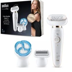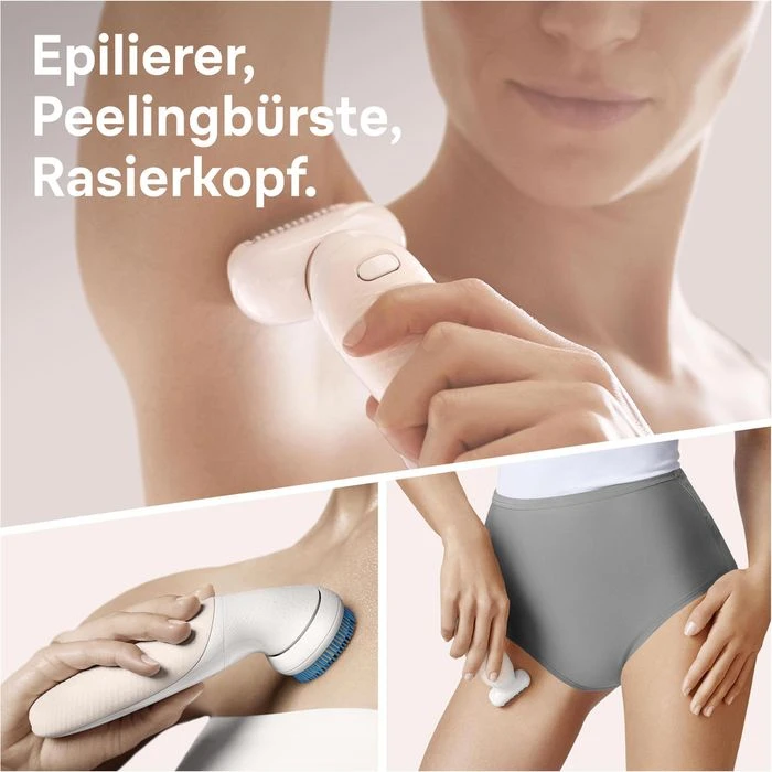 Lieferung: inkl. Epilieraufsatz, Rasieraufsatz, Trimmeraufsatz, Aufsatz für optimalen Hautkontakt, Aufsatz für Gesichtsepilation, Tiefenkörperpeeling-Bürste, Reinigungsbürste, Ladekabel, Aufbewahrungstasche