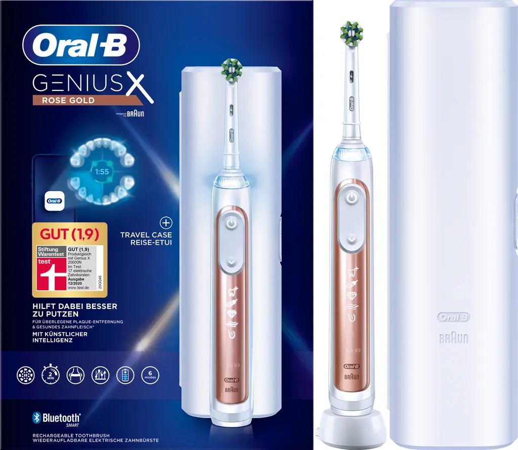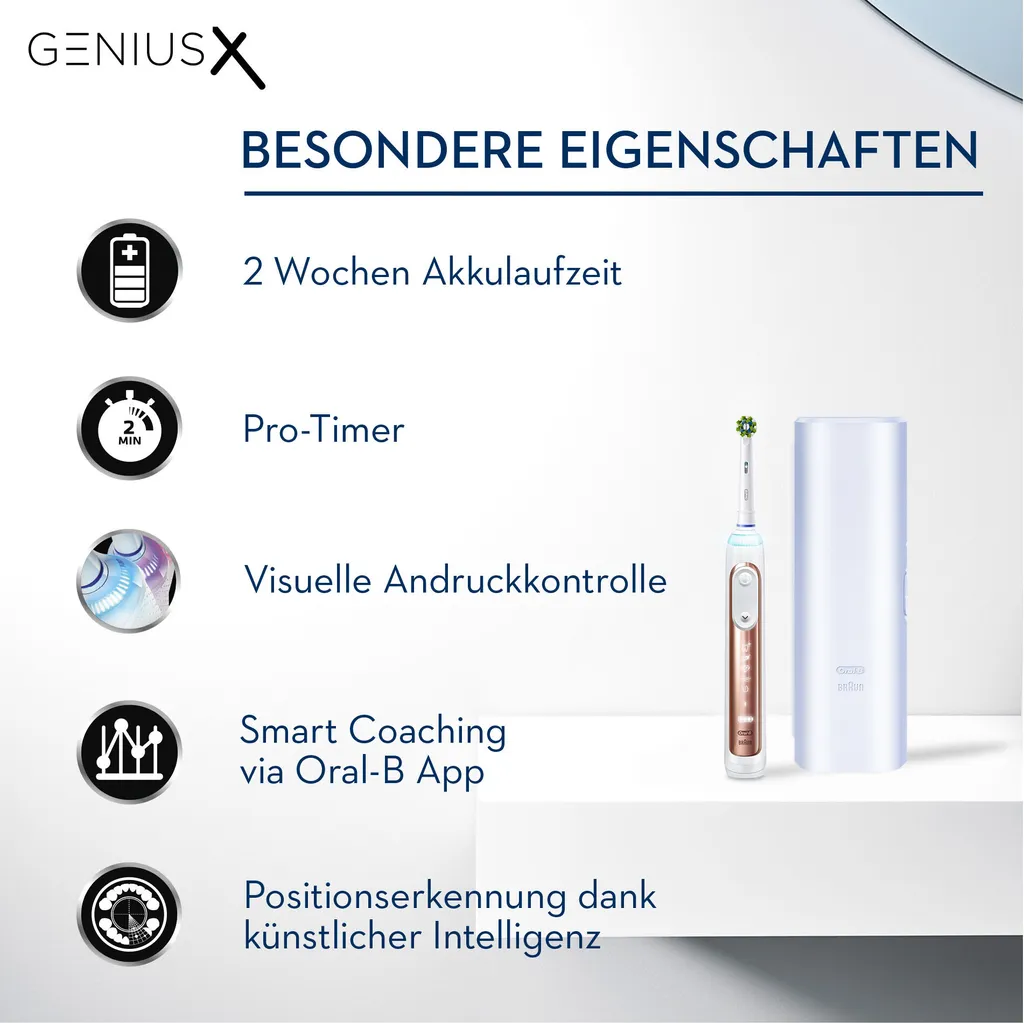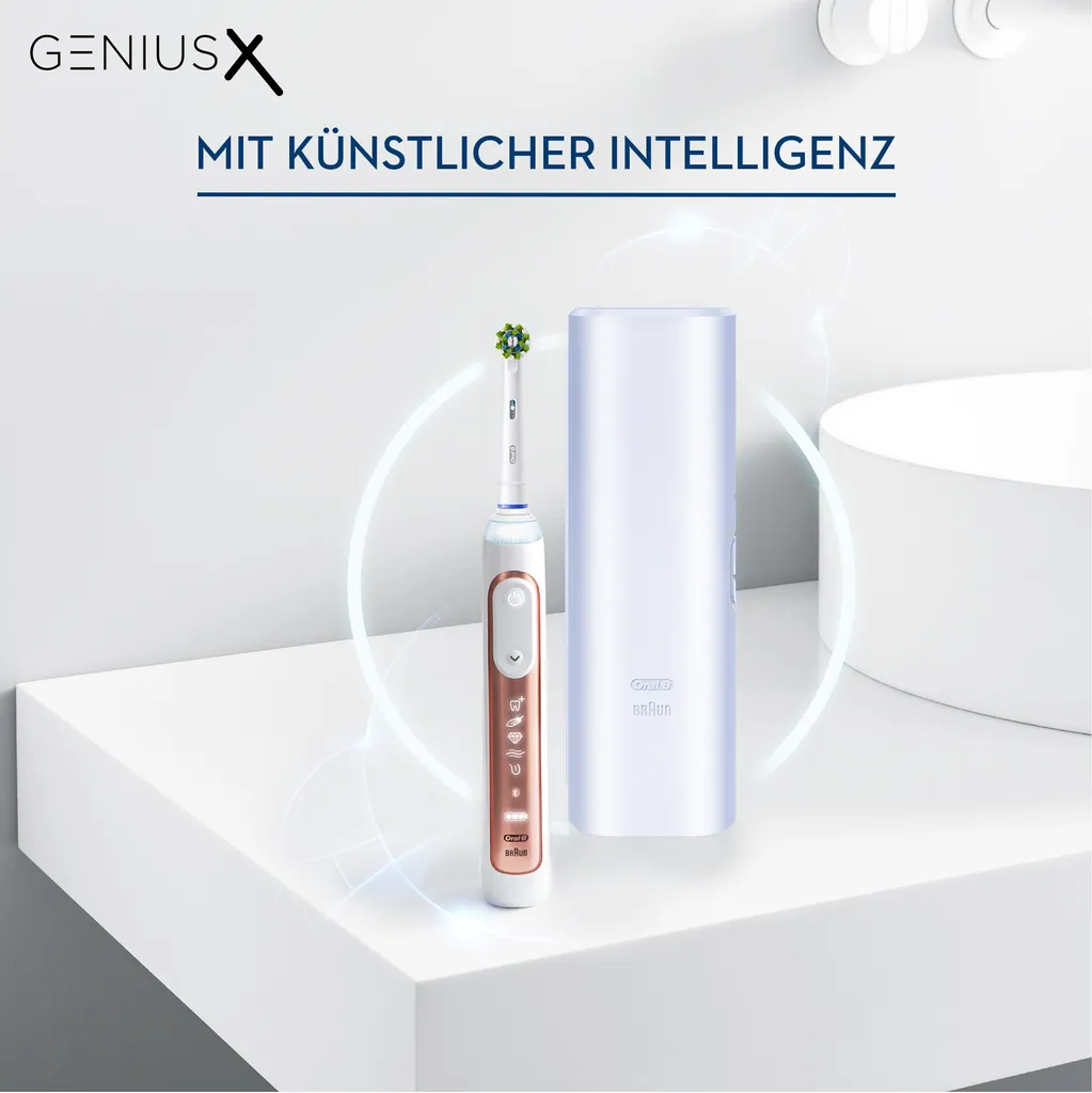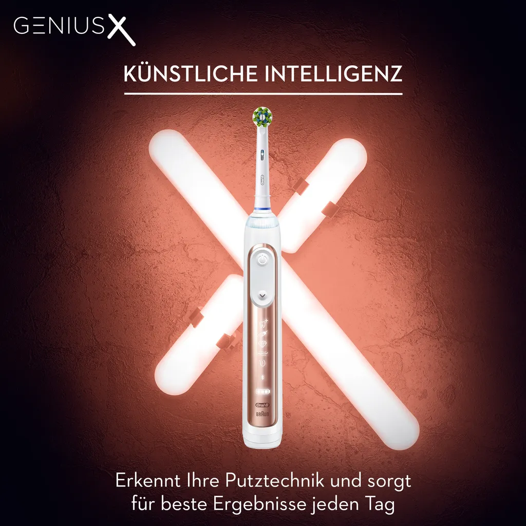 Die Oral-B Genius X mit künstlicher Intelligenz hat von dem Zahnputzverhalten tausender Menschen gelernt. Die integrierten Bewegungssensoren erkennen Ihre Putztechnik und sorgen so für beste Ergebnisse jeden Tag. Die intelligente Zahnbürste unterstützt Sie täglich mit individuellem Coaching, um alle Bereiche gleichmäßig mit dem richtigen Druck und in der richtigen Zeit zu putzen. Mit dem 2-Minuten Timer halten Sie zudem die von Zahnärzten empfohlene Putzzeit von 2 Minuten ein. Der runde Bürstenkopf von Oral-B entfernt bis zu 100% mehr Plaque als eine herkömmliche Handzahnbürste. Erleben Sie die einzigartige Kombination aus künstlicher Intelligenz, revolutionärer Zahnfleischschutz-Technologie und personalisierbarem SmartRing. Zusätzlich verfügt die Zahnbürste über einen Lithium-Ionen-Akku, der mit einer Vollladung mehr als 2 Wochen hält. Die Oral-B Genius X ist kompatibel mit allen Aufsteckbürsten von Oral-B, außer Pulsonic und iO. Erleben Sie den nächsten Schritt der Mundpflege mit Oral-B – die Zahnbürstenmarke Nr. 1, die von Zahnärzten weltweit am häufigsten empfohlen wird.