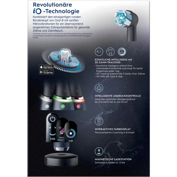 | Feature | Intelligente Andruckkontrolle, 3D-Zahn-Tracking, Putztechnikerkennung mit künstlicher Intelligenz, Individualisiertes Coaching für bessere Putzergebnisse | ||