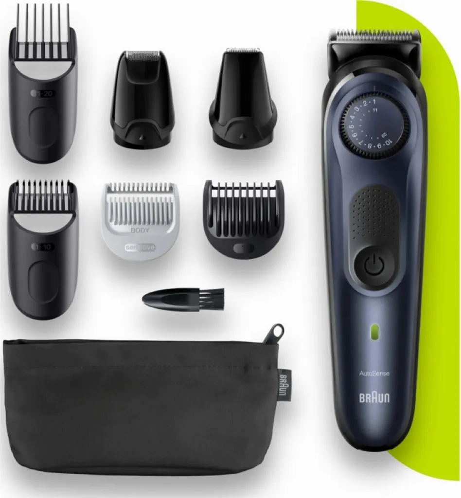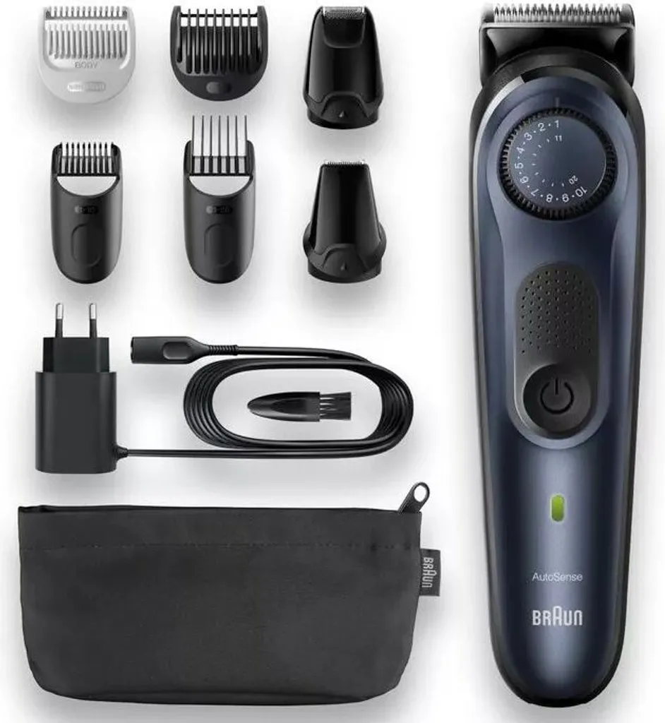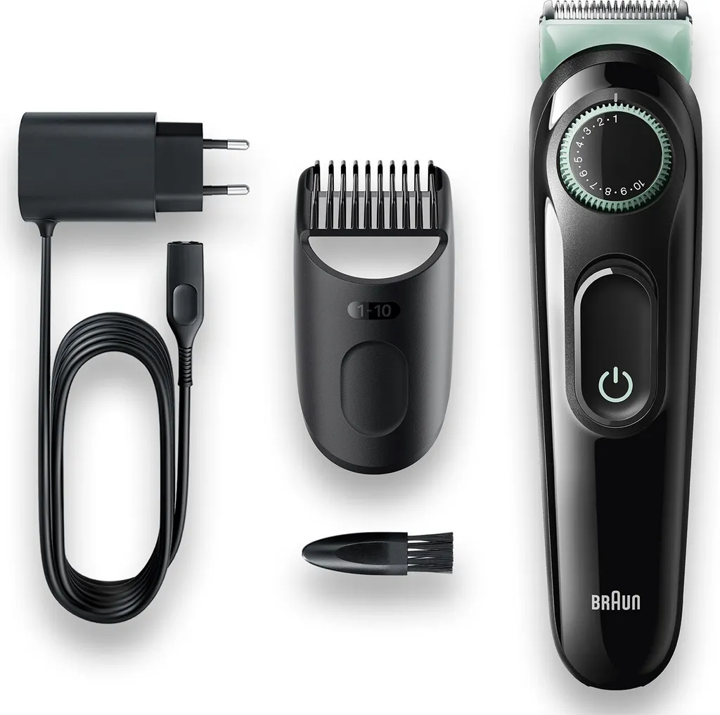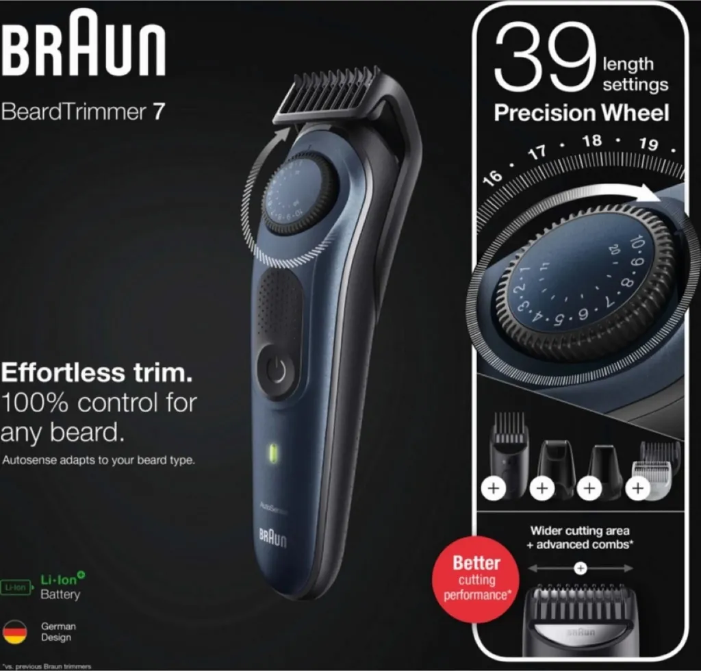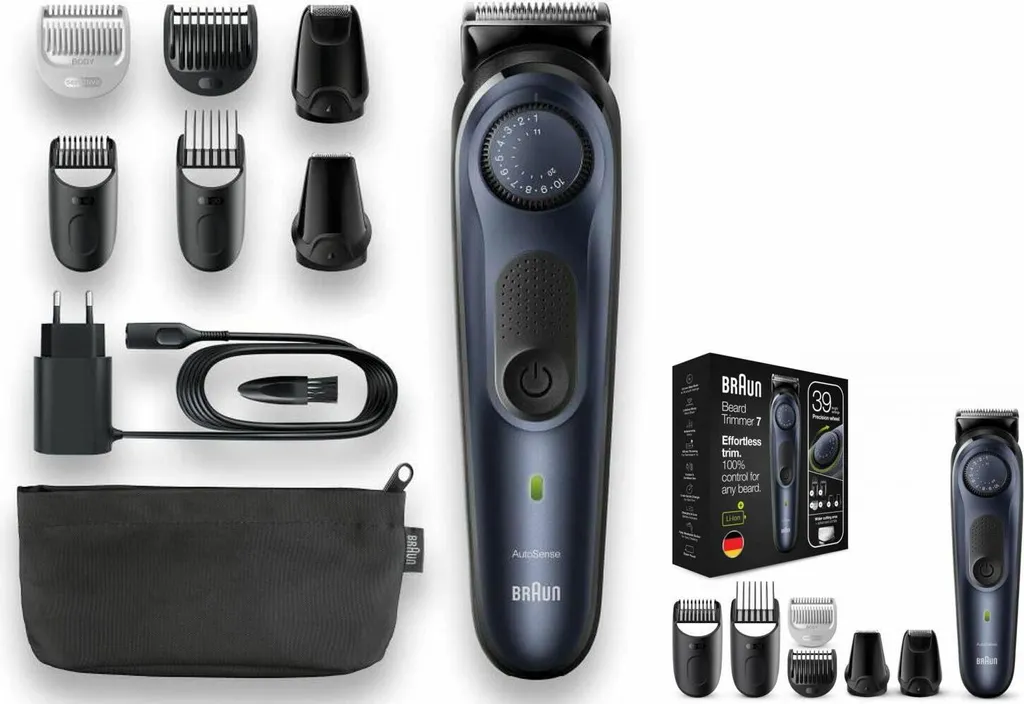 Erzielen Sie mühelos Ihren Style mit dem Braun BT7 Barttrimmer und Haarschneider für Herren. Dieser Barttrimmer ist schärfer, schneller und effizienter – mit einer breiteren Trimmfläche, um mehr Haare bei jedem Zug zu erfassen und zu schneiden (ggü. vorherigen Braun Trimmern). Der Barttrimmer 7 verfügt über ein Präzisionsrad mit 39 Längeneinstellungen, lebenslang scharfe Klingen und einen Lithium-Ionen-Akku. Mit abwaschbarem Trimmerkopf und Kammaufsätzen. Im Lieferumfang enthalten: 1x Barttrimmer und Haarschneider 2x Präzisionskammaufsätze für Bart und Haare 1x Detail-Trimmerkopf 1x Mini-Präzisionsscherkopf 1x Sensitiv-Kammaufsatz 1x Kammaufsatz (1 mm) 1x Reinigungsbürste 1x Netzteil-Ladegerät 1x Aufbewahrungstasche 1x Benutzerhandbuch