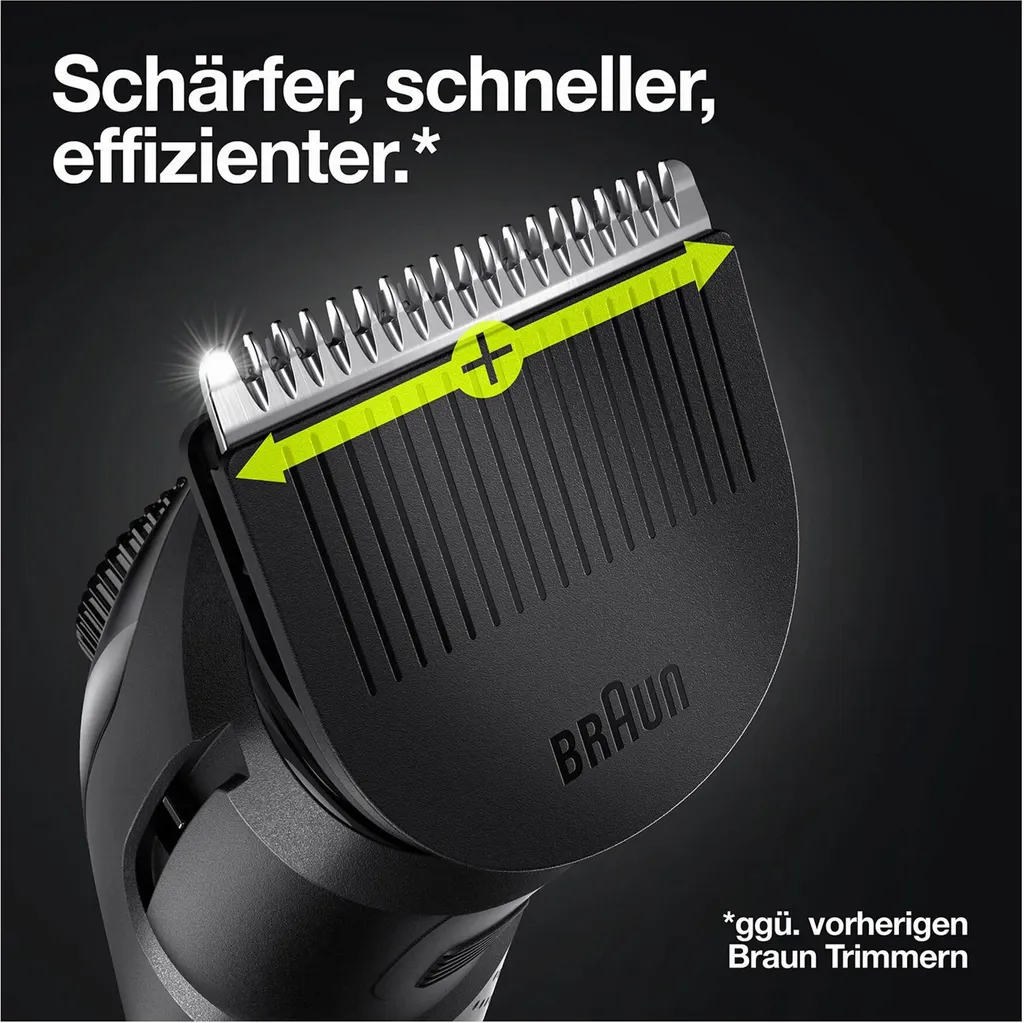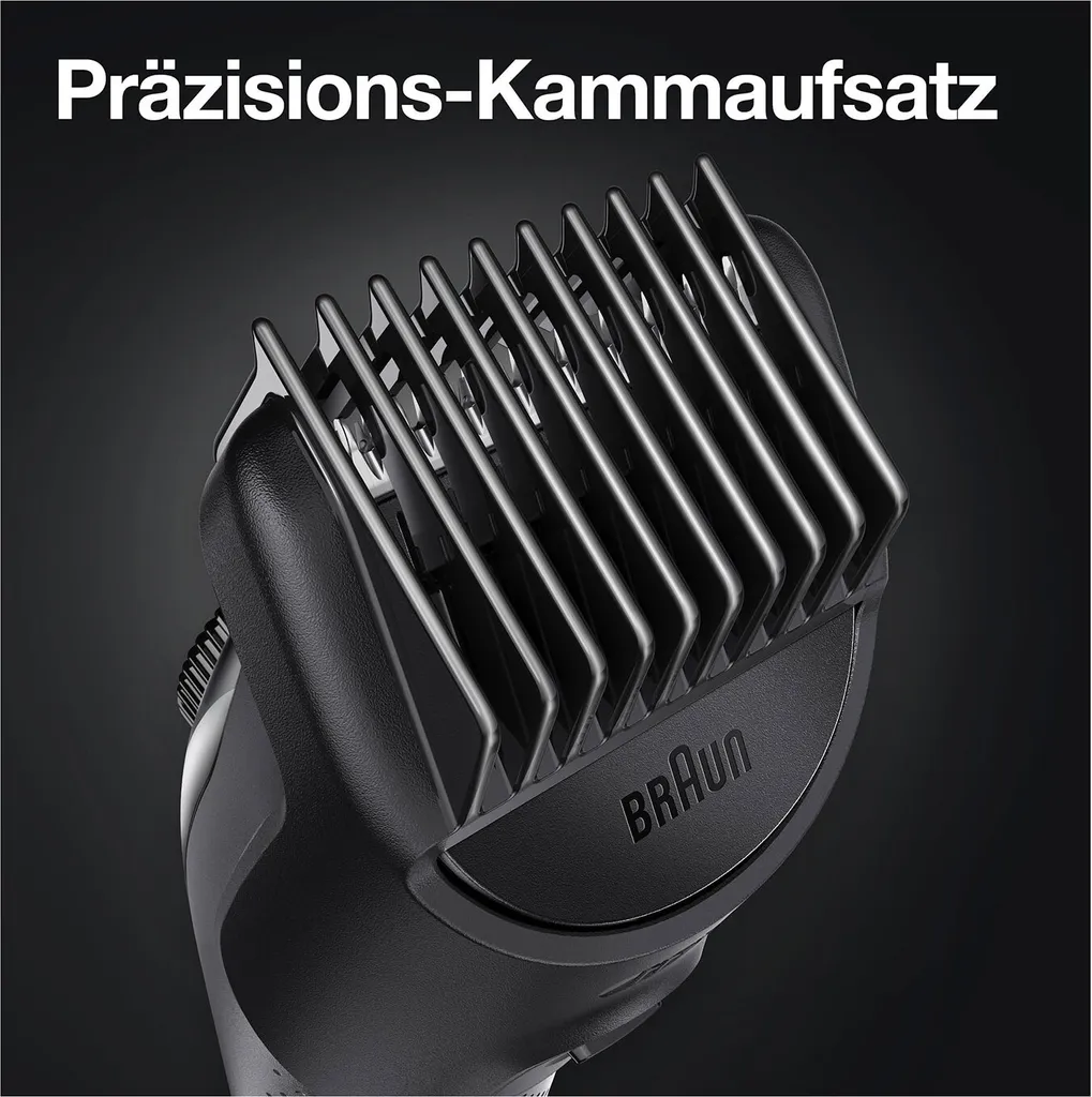 Der Trimmerkopf verfügt über eine breitere Trimmfläche und erfasst und schneidet mehr Haare in jedem Zug im Vergleich zu vorherigen Braun Trimmern. Erhalten Sie Ihren Style in weniger Zügen. Flexibles Styling für jedermann durch verschiedene Kammaufsätze können sowohl kurze als auch lange Bärte bis zu 21 mm pflegen.