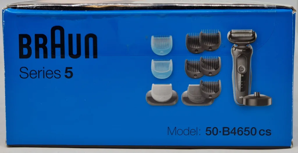 Braun Series 5 50-B4650cs. Rasierapparatsystem: Folienschaber. Produktfarbe: Blau, Display type: LED. Energiequelle: Akku, Batterietechnologie: Lithium-Ion (Li-Ion), Akku-/Batterietyp: Integrierte Batterie. Gewicht: 417 g, Akkugewicht: 18,6 g. Verpackungsart: Box, Paketbreite: 67 mm, Pakettiefe: 137 mm