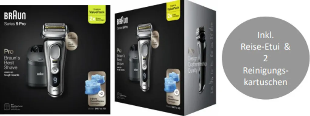 Geliefert wird: Procter&Gamble Braun Rasierer Vorteilspack Series9,noble metal 9 9467cc+CCR noble m, Verpackungseinheit: 1 Stück, EAN: 4210201405535