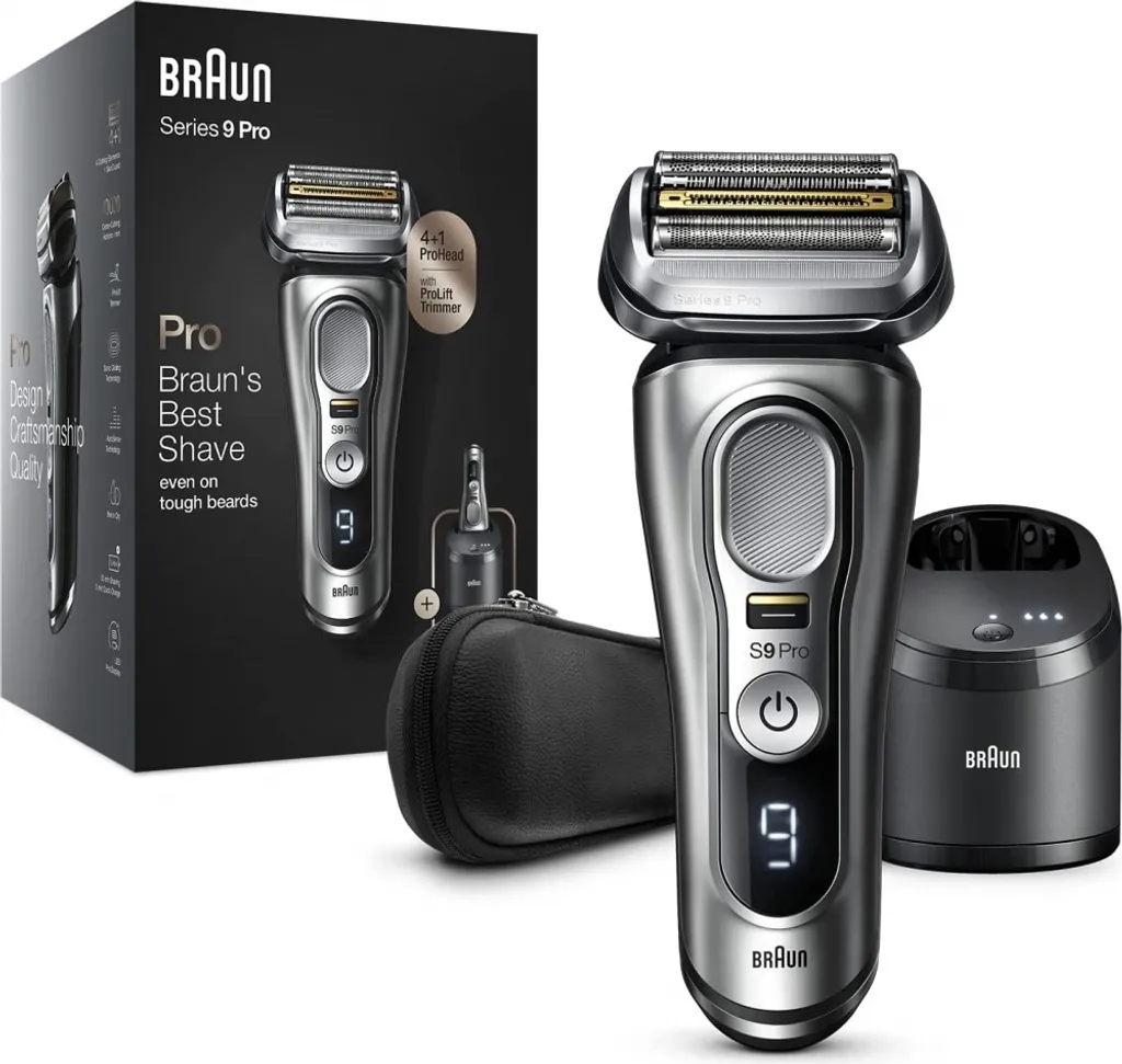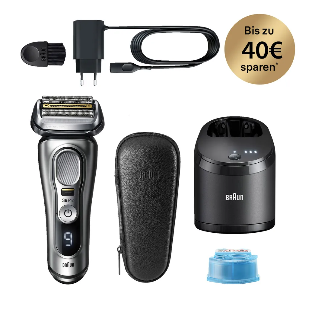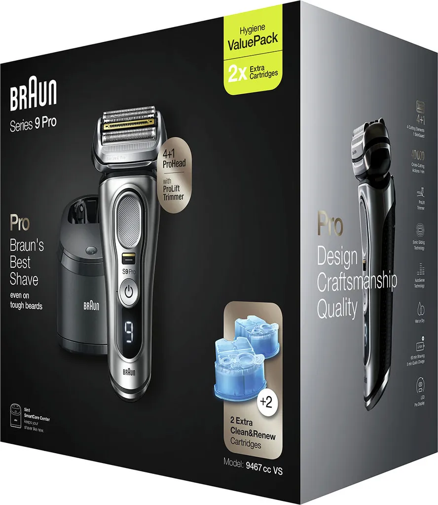 Elektronischer Premium Nass- und Trockenrasierer (Wet&Dry) für smarte Präzision, ProLift Trimmer für eine Rasur von 3- und 7-Tage-Bärten, 4+1 Scherelemente inkl. mit Titanium beschichtetem Mitteltrimmer, Sonic Gliding-Technologie, AutoSense-Technologie, 60 min Akkulaufzeit, 5 min Schnellladung, LED-Pro Display, Inklusive 5in1 Smartcare Center mit intelligenter Programmselektion, im Lieferumfang enthalten: 1x Elektrischer Rasierer 9 Pro, 1x 5-in-1 Reinigungsstation (SmartCare Center), 1x CCR Reinigungskartusche, 1x Reise-Etui, 1x Reinigungsbürste, 1x Netzteil, kurzes Netzkabel, 1x Benutzerhandbuch