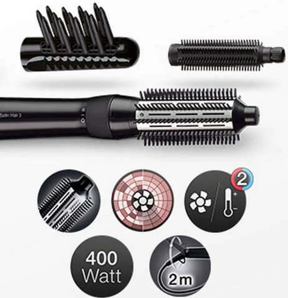 Braun Satin Hair 3 AS 330 Warmluft-Lockenbürste – Trocknen und Stylen in einem Schritt.Das kennen Sie: den Blick in den Spiegel und all die Gedanken rund um Ihr Haar. Möchten Sie eine Basisfrisur für jeden Tag oder lieber einen ausgefalleneren Look? Möchten Sie es glatt und geschmeidig oder mit leichten Wellen und Locken?Braun Warmluft-Lockenbürsten trocknen und stylen Ihr Haar in einem Arbeitsgang: Formen von Wellen und Locken, Modellieren der Haarspitzen oder Aufbau von Volumen direkt am Haaransatz.