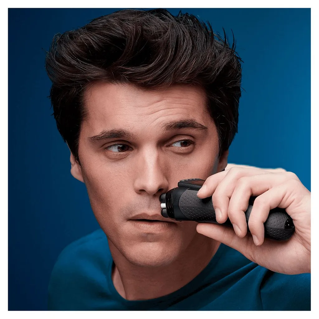 Weitere Merkmale : MicroComb-Technologie. 2x SensoFoil. Mitteltrimmer – schneidet problemlos auch längere und schwierigere Haare. Triple Action FreeFloat-System. Schnurgebundene/schnurlose Rasur.