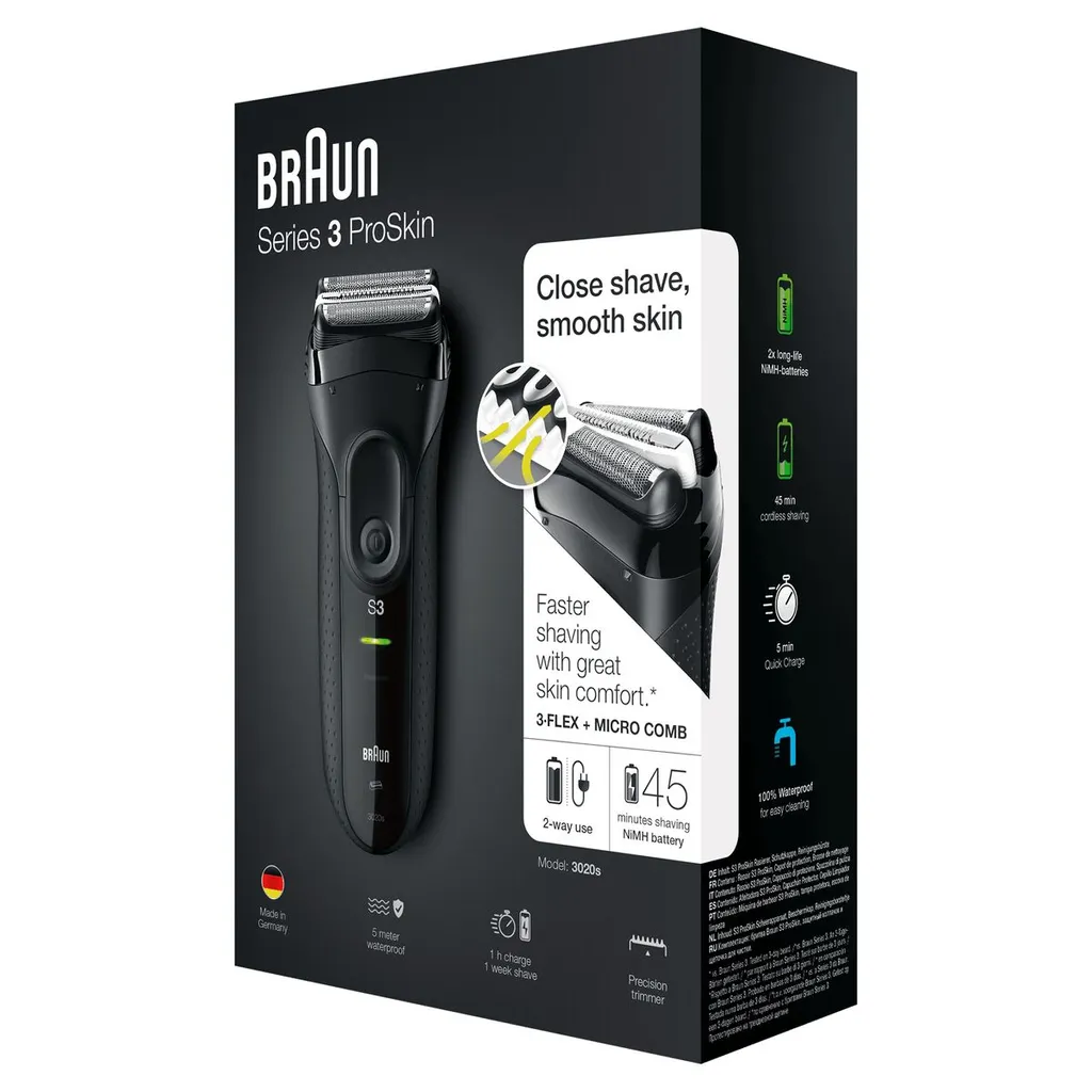 Braun Series 3 3020. Rasierapparatsystem Folienschaber. Produktfarbe Schwarz, Display-Typ LED. Energiequelle Batterie/Akku, Batterietechnologie Nickel-Metallhydrid (NiMH), Akku-/Batterietyp Eingebaut. Verpackungsbreite 57 mm, Verpackungstiefe 155 mm, Verpackungshöhe 222 mm. Gewicht 362 g