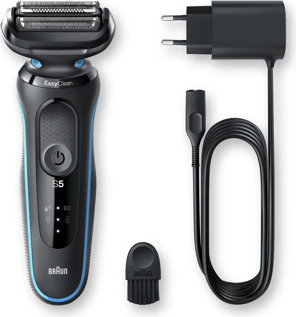 Der Braun Series 5 Elektrorasierer für Herren für eine einfache Rasur mit 3 flexiblen Klingen, die sich an Ihre Gesichtskonturen anpassen.Das EasyClean System bietet eine schnelle und einfache Reinigung, ohne Abnahme des Scherkopfs.Kompatibel mit EasyClick-System. Ihr Rasierer kann mit einem einfachen Klick umgerüstet und die Aufsätze ausgetauscht werden – für noch mehr Funktionen. Der Lithium-Ionen-Akku ermöglicht ein Rasieren von bis zu 3 Wochen (50 Minuten Akkulaufzeit) und eine 5-minütige Schnellladung, die für eine Anwendung reicht. Dieser elektrische Rasierer für Herren ist 100% wasserdicht und für die Nass- und Trockenrasur geeignet. Modellnummer: 50-M1000sIm Lieferumfang enthalten:1x Series 5 Rasierer für Herren – türkis1x Schutzkappe1x Netzteil mit automatischer Anpassung an 100 V bis 240 V1x Reinigungsbürste