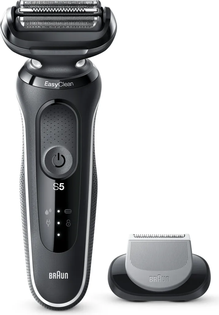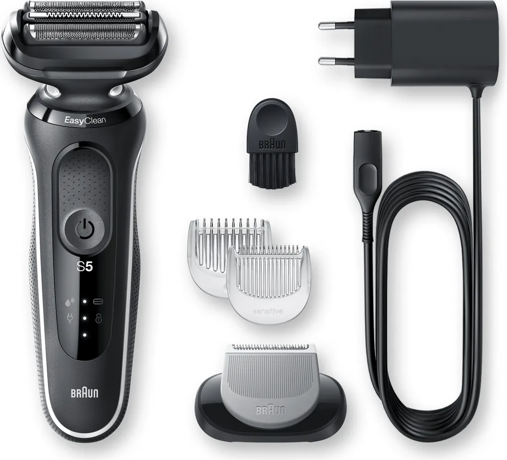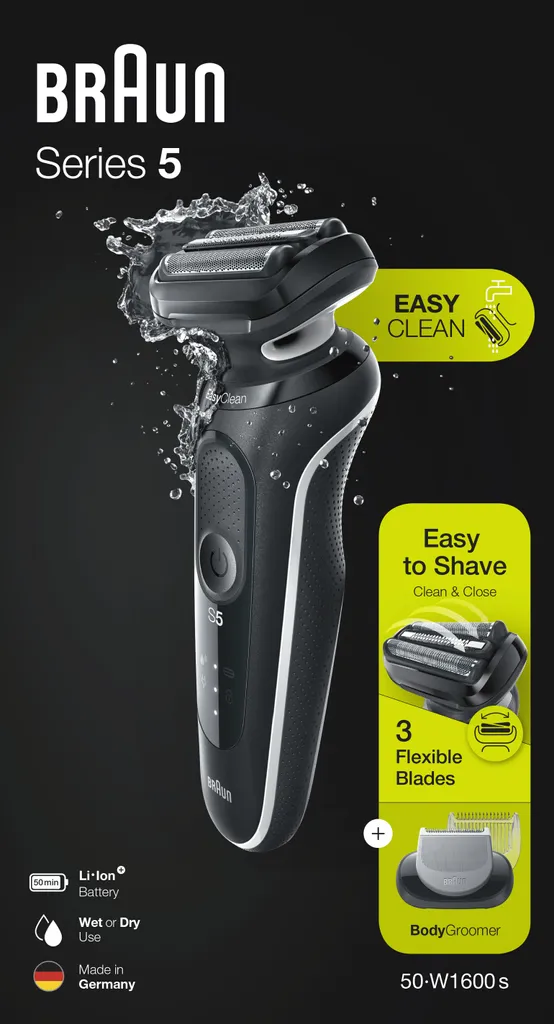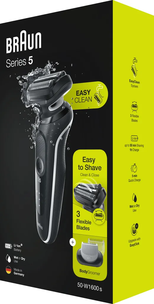 Der Braun Series 5 Elektrorasierer für Herren für eine einfache Rasur mit 3 flexiblen Klingen, die sich an Ihre Gesichtskonturen anpassen.Das EasyClean System bietet eine schnelle und einfache Reinigung, ohne Abnahme des Scherkopfs.Kompatibel mit EasyClick-System. Ihr Rasierer kann mit einem einfachen Klick umgerüstet und die Aufsätze ausgetauscht werden – für noch mehr Funktionen. In dem Set ist bereits ein EasyClick Aufsatz enthalten: Bodygroomer-Aufsatz.Der Lithium-Ionen-Akku ermöglicht ein Rasieren von bis zu 3 Wochen (50 Minuten Akkulaufzeit) und eine 5-minütige Schnellladung, die für eine Anwendung reicht. Dieser elektrische Rasierer für Herren ist 100% wasserdicht und für die Nass- und Trockenrasur geeignet. Modellnummer: 50-W1600sIm Lieferumfang enthalten:1x Series 5 Rasierer für Herren – weiß1x EasyClick Aufsatz: Bodygroomer-Aufsatz1x Schutzkappe1x Netzteil mit automatischer Anpassung an 100 V bis 240 V1x Reinigungsbürste