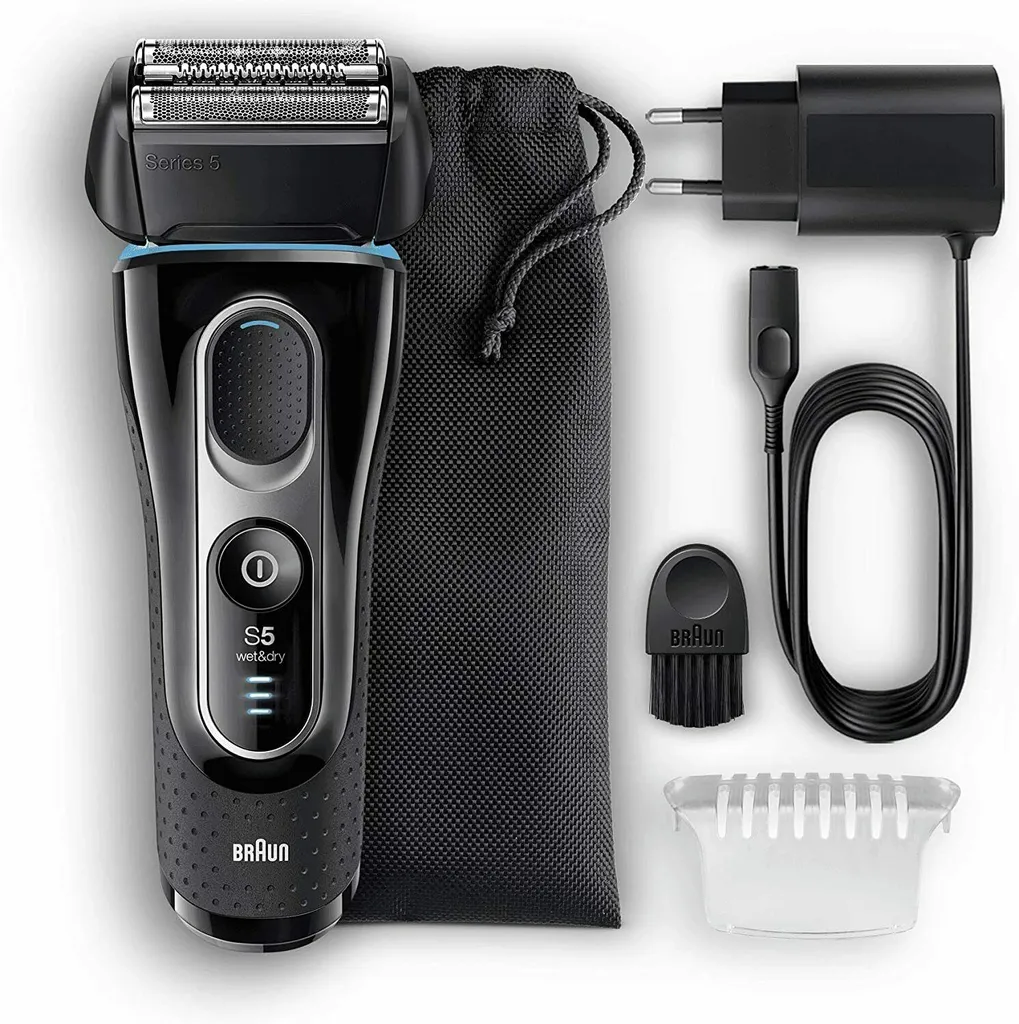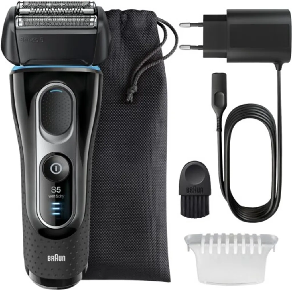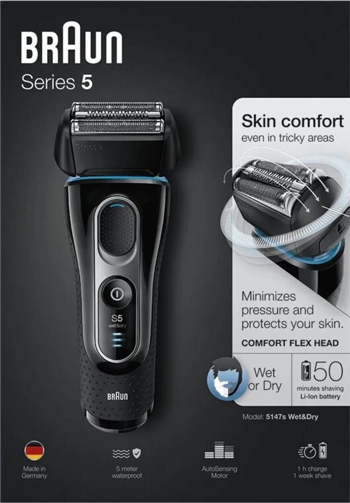 - Braun Series 5 5147s Elektrischer Rasierer, mit Präzisionstrimmer, Wet&Dry, 50 Minuten Akkulaufzeit, wiederaufladbarer und kabelloser Elektrorasierer, schwarz/blau/chrom