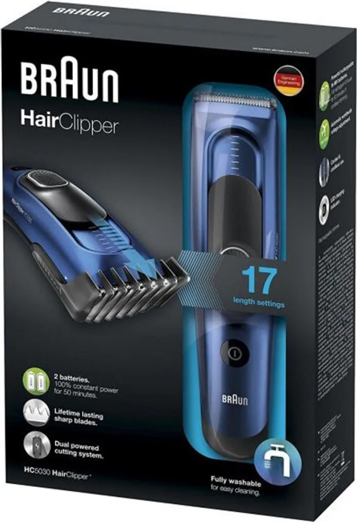 Braun HC5030. Produktfarbe: Schwarz, Blau, Minimum Haarlänge: 3,5 cm, Maximum Haarlänge: 3 mm. Energiequelle: Wechselstrom/Batterie, Betriebsdauer: 50 min, Akku-/Batterietyp: Eingebaut. Verpackungsbreite: 570 mm, Verpackungstiefe: 155 mm, Verpackungshöhe: 222 mm