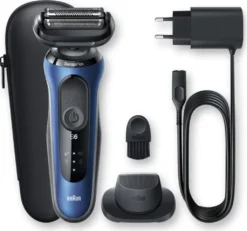 Braun Series 6 . Rasierapparatsystem: Folienschaber, Steuerung: Schieber, Rasiermodi: Besonders empfindlich, Intensiv, Normal. Produktfarbe: Blau, Display-Typ: LED, LED-Anzeigen: Ladend. Energiequelle: Akku, Batterietechnologie: Lithium-Ion (Li-Ion), Akku-/Batterietyp: Integrierte Batterie. Funktionen der Rasierer-Basisstation: Ladend, Reinigung, Schmieren. Verpackungsart: Box