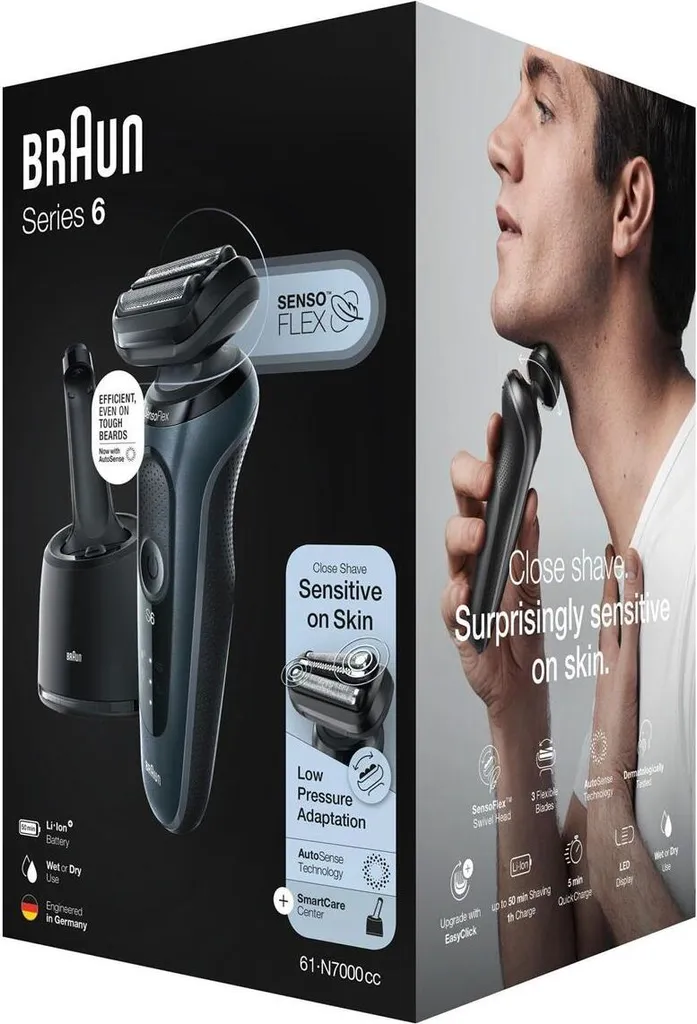 Der Braun Series 6 Elektrorasierer für Herren verfügt über einen getesteten beweglichen SensoFlex-Scherkopf und SensoFoil-Klingen, die eine Druckanpassung ermöglichen und für eine gründliche und zugleich sanfte Rasur sorgen.