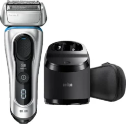 Series 8 8370cc Elektrorasierer in silberfarben mit Reinigungs- und Ladestation und ReiseetuiDer elektrische Rasierer Braun Series 8 bietet eine präzise und angenehme Rasur. Der präzise Kopf erfasst die Haare selbst in den schwierigsten Bereichen, um makellose Ergebnisse zu erzielen. Die Sonic-Technologie erzeugt Mikro-Vibrationen, damit der elektrische Rasierkopf während der Rasur über Ihre Haut gleitet. Dieser Präzisionsscherkopf eignet sich für Nass- und Trockenrasur. Jetzt mit 20 % mehr Akkuleistung im Vergleich zum Series 7 Rasierer.Spezialisierter TrimmerRichtet flach anliegende Haare vor dem Schneiden auf.2x OptiFoilErreicht alle übrigen Haare für eine perfekte Rasur.SkinGuardSchützt Ihre Haut bei jedem ZugFlexibler 8-D ScherkopfDer in 8 Richtungen schwenkbare Rasierkopf passt sich sogar den schwierigsten Konturen an. Mit einzeln schwenkbaren Scherfolien und einem auf dem schwenkbaren Kopf aufgebrachten Trimmer. Kommt der Haut auf 0,05 mm nah.Anpassung an die BartdichteAnalysiert Ihren Bart und passt die Leistung entsprechend an.LED-DisplayAlle Informationen auf einen Blick: Das präzise LED-Display zeigt den Akku- und Reinigungsstatus an sowie die Einschaltsperre.Fortschrittlicher 32-Bit-ChipPasst die Leistung des Rasierers an Ihren Bart an und ermöglicht selbst bei einem dichten Bart eine höchst effiziente Rasur.SyncroSonic-Technologie mit 30.000 Schneidebewegungen pro Minute.In Synergie mit Sonic-Technologie. Die patentierte Braun SyncroSonic-Technologie analysiert Ihren Bart und passt sich ihm an.Reinigungs- und LadestationEin Rasierer, der sich jeden Tag anfühlt. Die Reinigungs- und Ladestation reinigt hygienisch, ölt und pflegt Ihren Rasierer und lädt ihn auf – mit nur einem Knopfdruck.PräzisionstrimmerDer integrierte und hautfreundliche Präzisionstrimmer kann aus der Rückseite des Rasierers herausgeschoben werden. Mit ihm lassen sich die Koteletten einfach und exakt konturieren.Lithium-Ionen-AkkuUnser fortschrittlichster Lithium-Ionen-Akku. Hält jetzt 20 % länger. Eine Ladung – einen Monat Rasieren. Eine Schnellladung von fünf Minuten ist ausreichend für eine Rasur.100 % wasserdichtReinigen Sie Ihren Rasierer ganz einfach unter Wasser. Das ist insbesondere in schwer zugänglichen Bereichen wie unterhalb des Kinns oder unter der Nase sehr hilfreich.Wet & DrySie können sich trocken rasieren oder Wasser, Schaum oder Gel verwenden für besseres Gleiten und ein glatteres Hautgefühl.