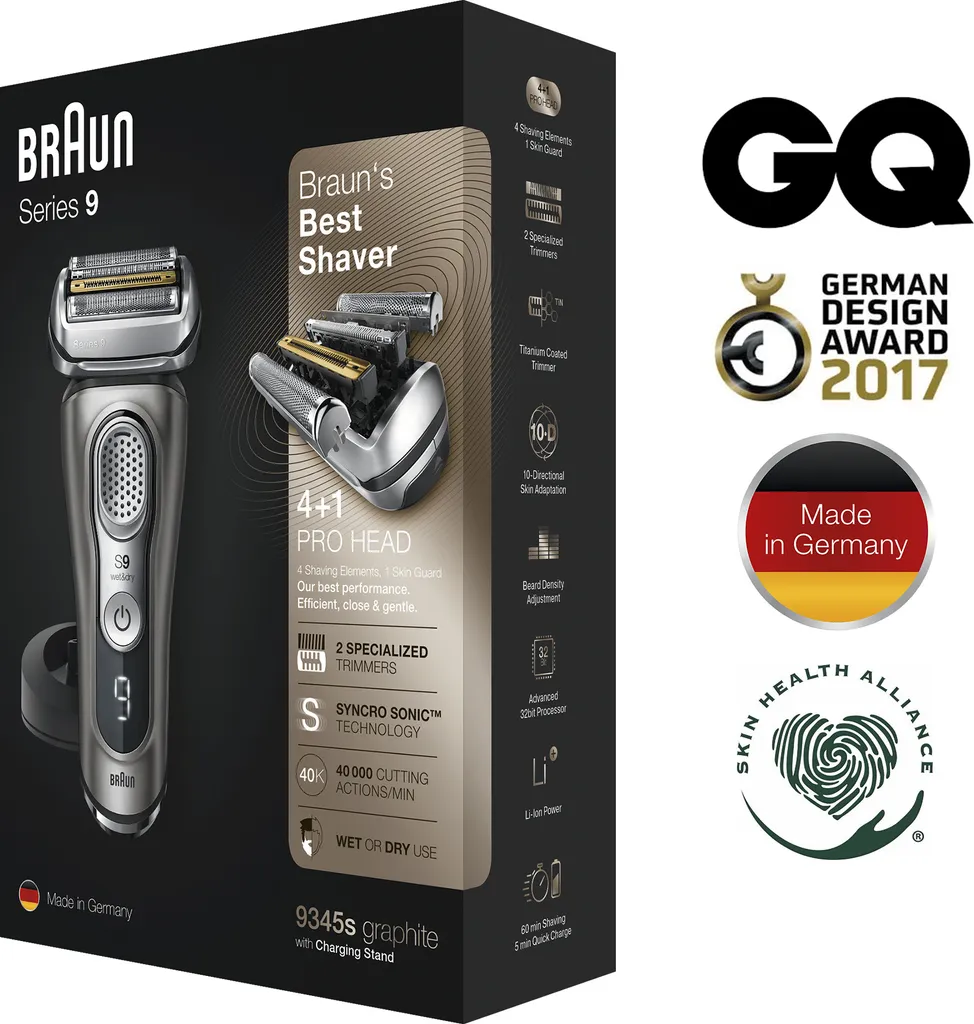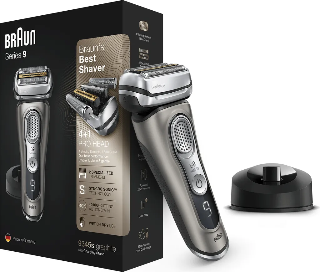 Brauns Premium Rasierer mit 4+1 Scherkopf. Effizient. Gründlich. Angenehm zur Haut. Deutschlands Nr. Effizient und sanft. Egal ob 1-, 3- oder 7-Tage Bart. Der Präzisionsscherkopf bietet Ihnen eine glatte und gleichzeitig sanfte Rasur ohne Kompromisse. Der Elektrorasierer für Herren gleitet sanft über die Haut und eignet sich für die Nass- und Trockenrasur. 60 Minuten Akkulaufzeit dank Lithium-Ionen-Akku. Eine Schnellladung von 5 Minuten reicht für eine Rasur. Inklusive Ladestation. Produkt vom GQ Magazin empfohlen.Modellnummer: 9345sIm Lieferumfang enthalten: 1x Rasierapparat1x Ladestation1x Stoff-Reise-Etui1x Netzteil1x Reinigungsbürste