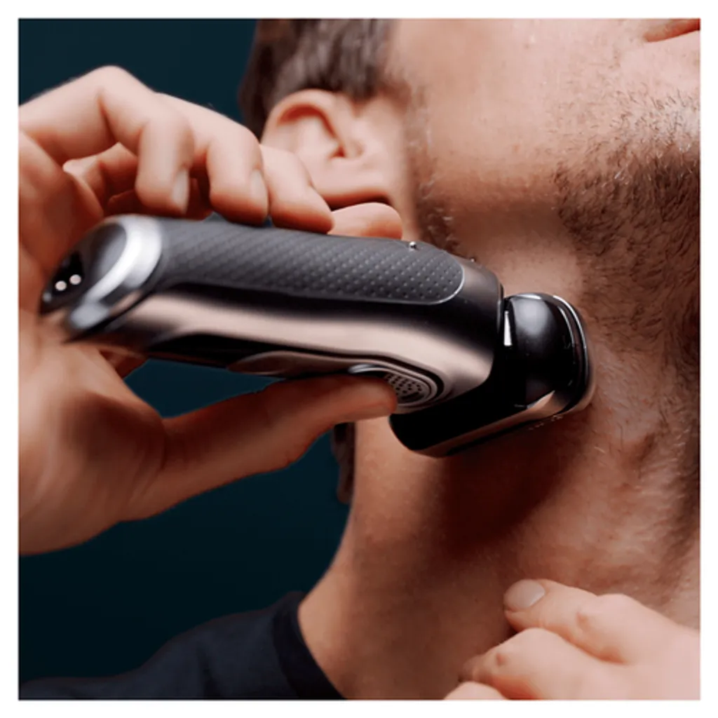 Der Braun Series 9 enthält fünf synchronisierte Rasiererelemente für eine makellose Rasur in einem Zug. Zwei spezielle Mitteltrimmer erfassen die unterschiedlichsten Haartypen und machen den Series 9 zum effizientesten Rasierer von Braun**. ** An 3-Tage-Bärten getestet.