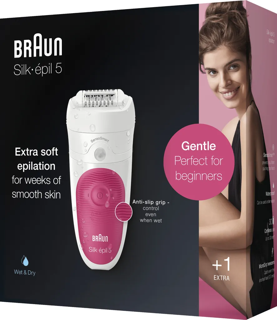 Der Braun Silk-épil 5-500 eignet sich ideal für eine sanfte Haarentfernung. Die Micro-Grip-Technologie mit 28 Pinzetten entfernt selbst kürzeste Härchen von 0,5 mm – seidig glatte Haut für Wochen, nicht nur Tage. Der Braun Silk-épil 5-500 hat eine integrierte SensoSmart-Drucksensortechnologie, die Ihre Epilation kontrolliert und noch mehr Haare in einem Zug entfernt. Bis zu 30 Minuten kabellose Anwendung. Im Lieferumfang enthalten: 1x Epilierer 1x Aufsatz für optimalen Hautkontakt 1x Reinigungsbürste 1x Ladegerät