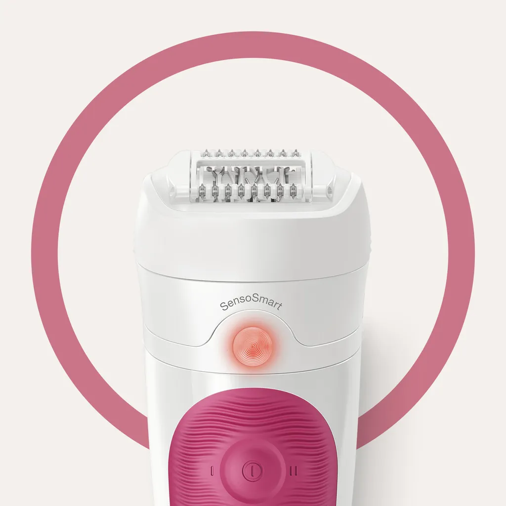 - SensoSmart Andruckkontrolle: Die SensoSmart-Leuchte leuchtet rot auf, wenn Sie beim Epilieren zu fest aufdrücken und stellt sicher, dass der richtige Druck angewendet wird