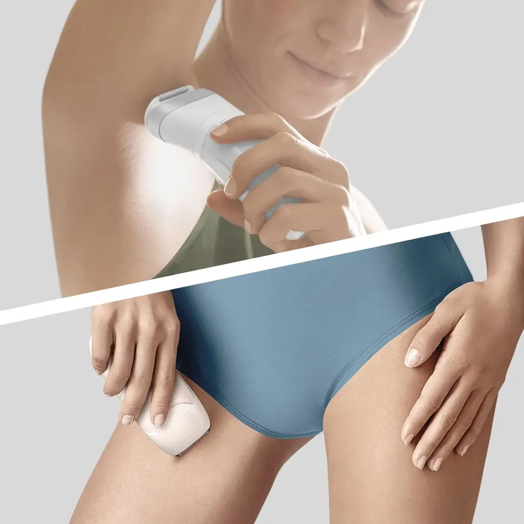 Sanfte Haarentfernung auch in empfindlichen Bereichen, wie der Bikinizone dank des Rasier- und Trimmeraufsatzes: keine Schmerzen, bequem zu Hause.