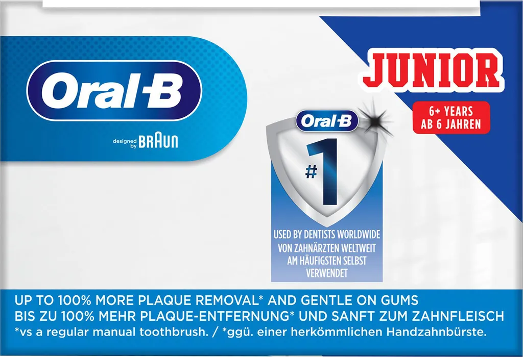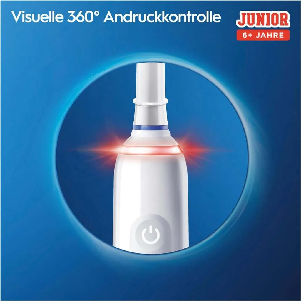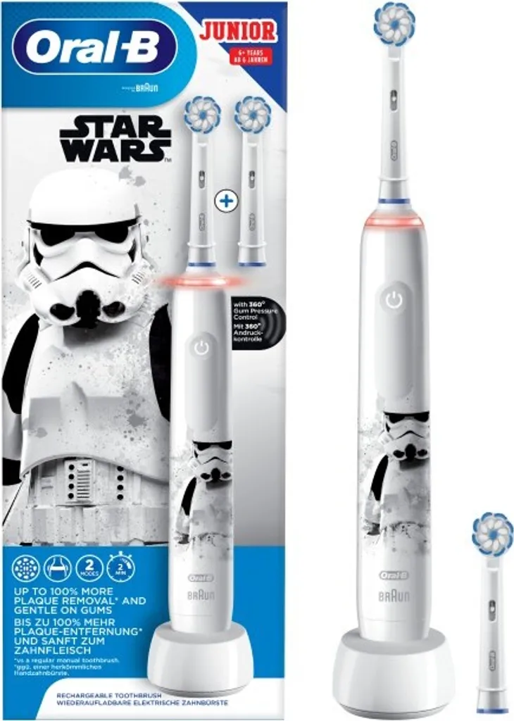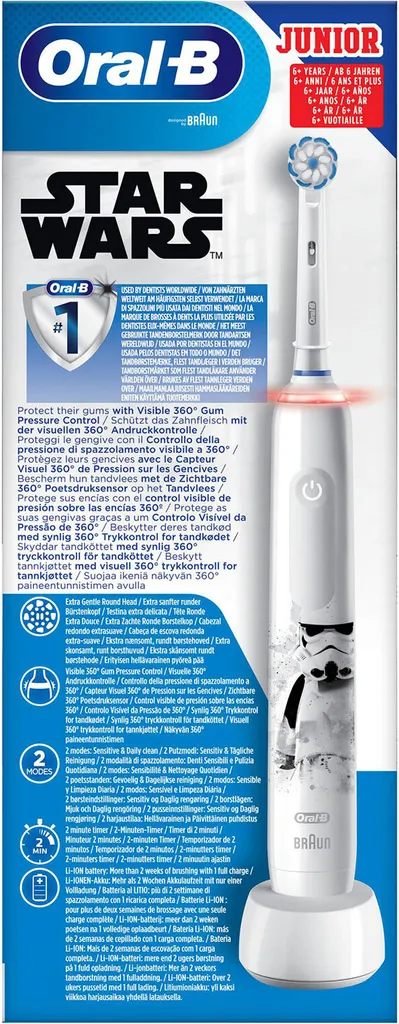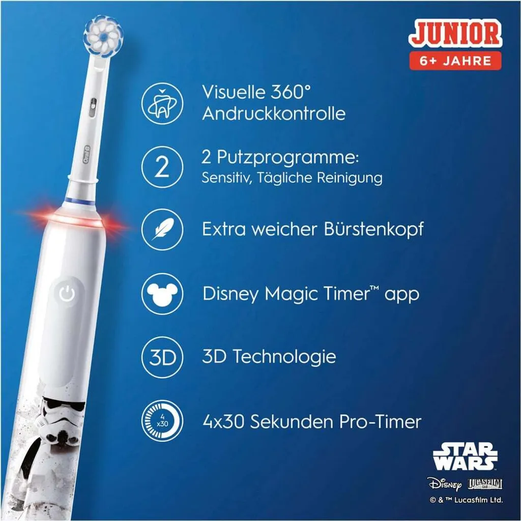 Die Oral-B Junior Star Wars elektrische Zahnbürste für Kinder ab 6 Jahren sorgt mit den weichen Borsten des Sensitive Clean Bürstenkopfes für eine sanfte und effektive Plaque-Entfernung. Die Zahnbürste bietet eine Auswahl zwischen 2 verschiedenen Putzprogrammen für individuelle Mundpflegebedürfnisse: Tägliche Reinigung und Sensitiv. Der integrierte Timer hilft die von Zahnärzten empfohlene Putzzeit von 2 Minuten einzuhalten. Damit das Zähneputzen noch mehr Spaß macht, kann die Zahnbürste mit der en Disney Magic Timer App von Oral-B verwendet werden. 90% der Kinder putzen mit der App länger. Die Zahnbürste hilft Kindern, eigenständig ihre Zähne zu putzen und gesunde Putzgewohnheiten zu entwickeln.