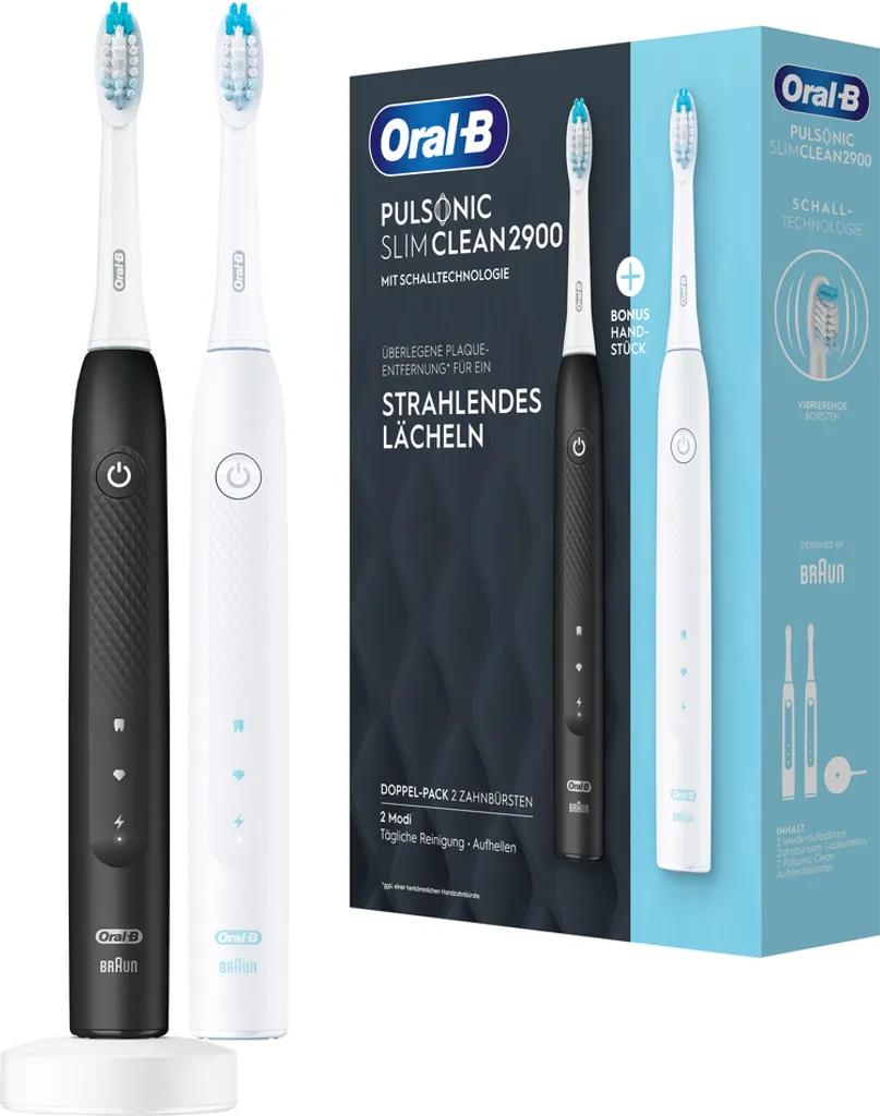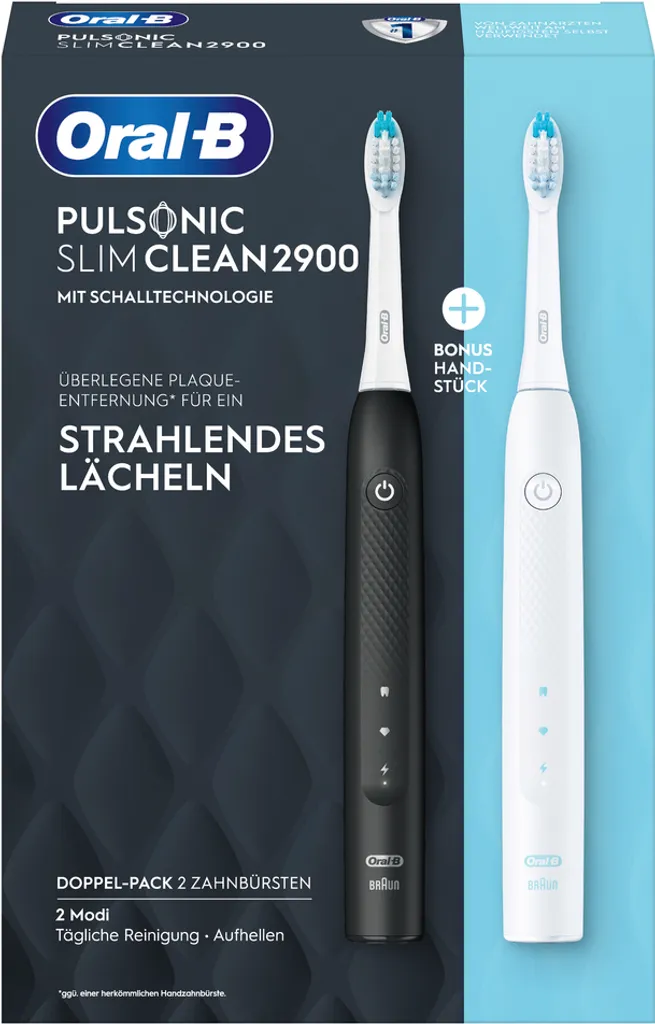 - Oral-B Pulsonic Slim Clean 2900 Doppelpack Elektrische Schallzahnbürste für eine sanfte Reinigung, 2 Putzmodi, Timer, 2 Aufsteckbürsten, schwarz/weiß