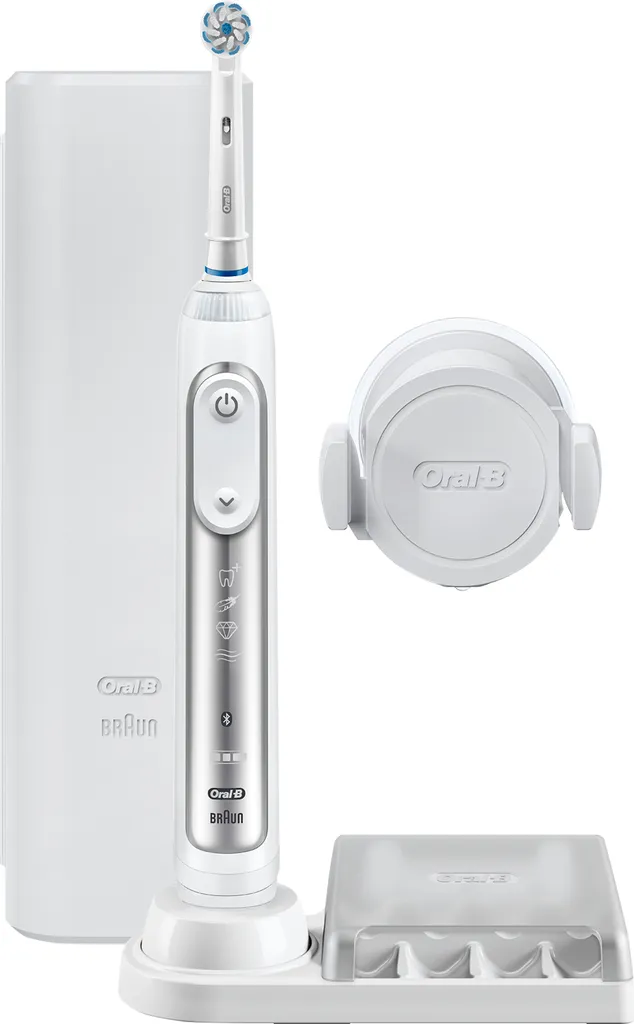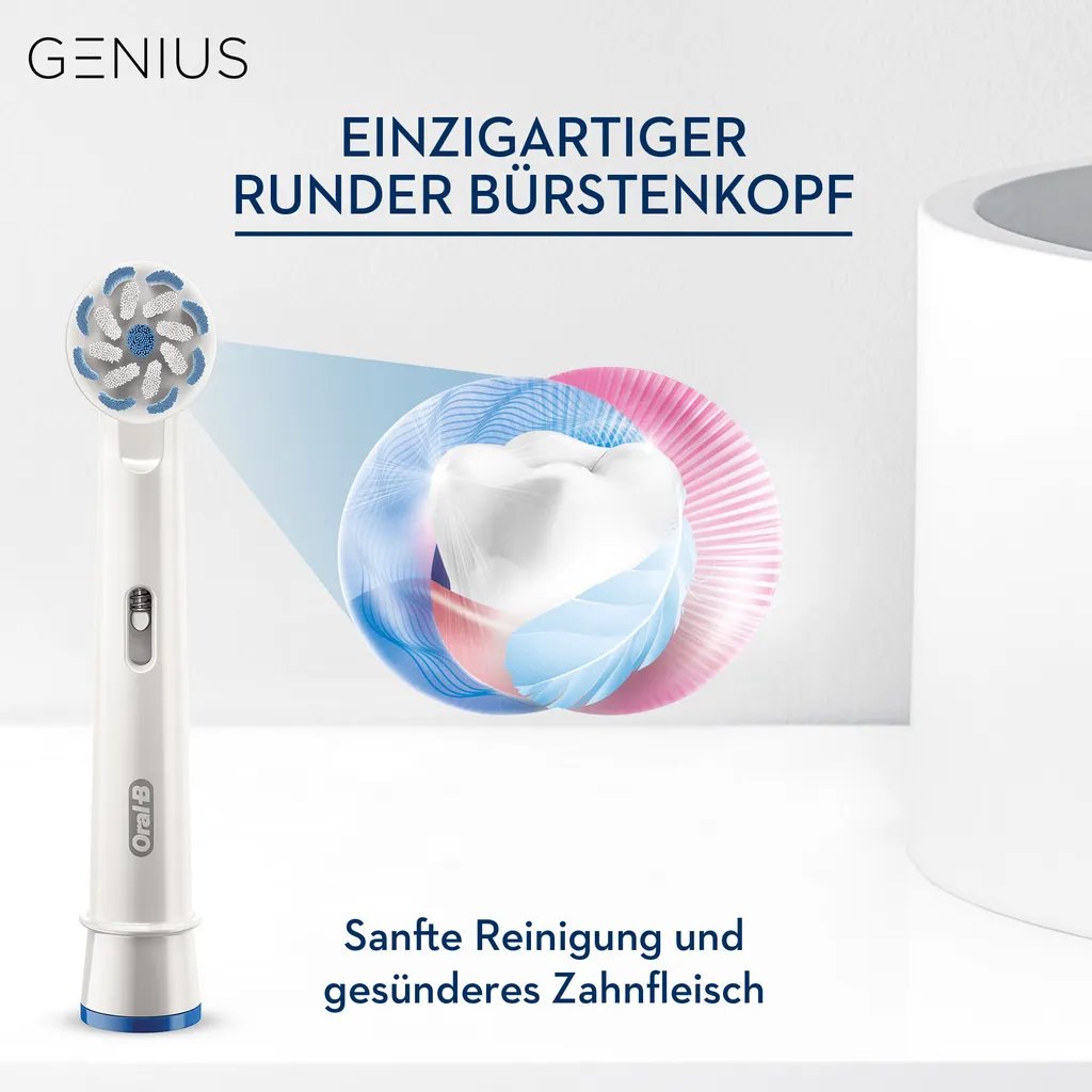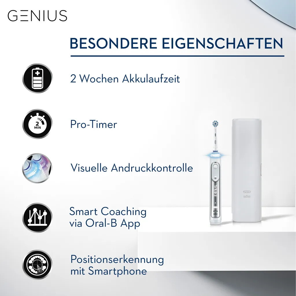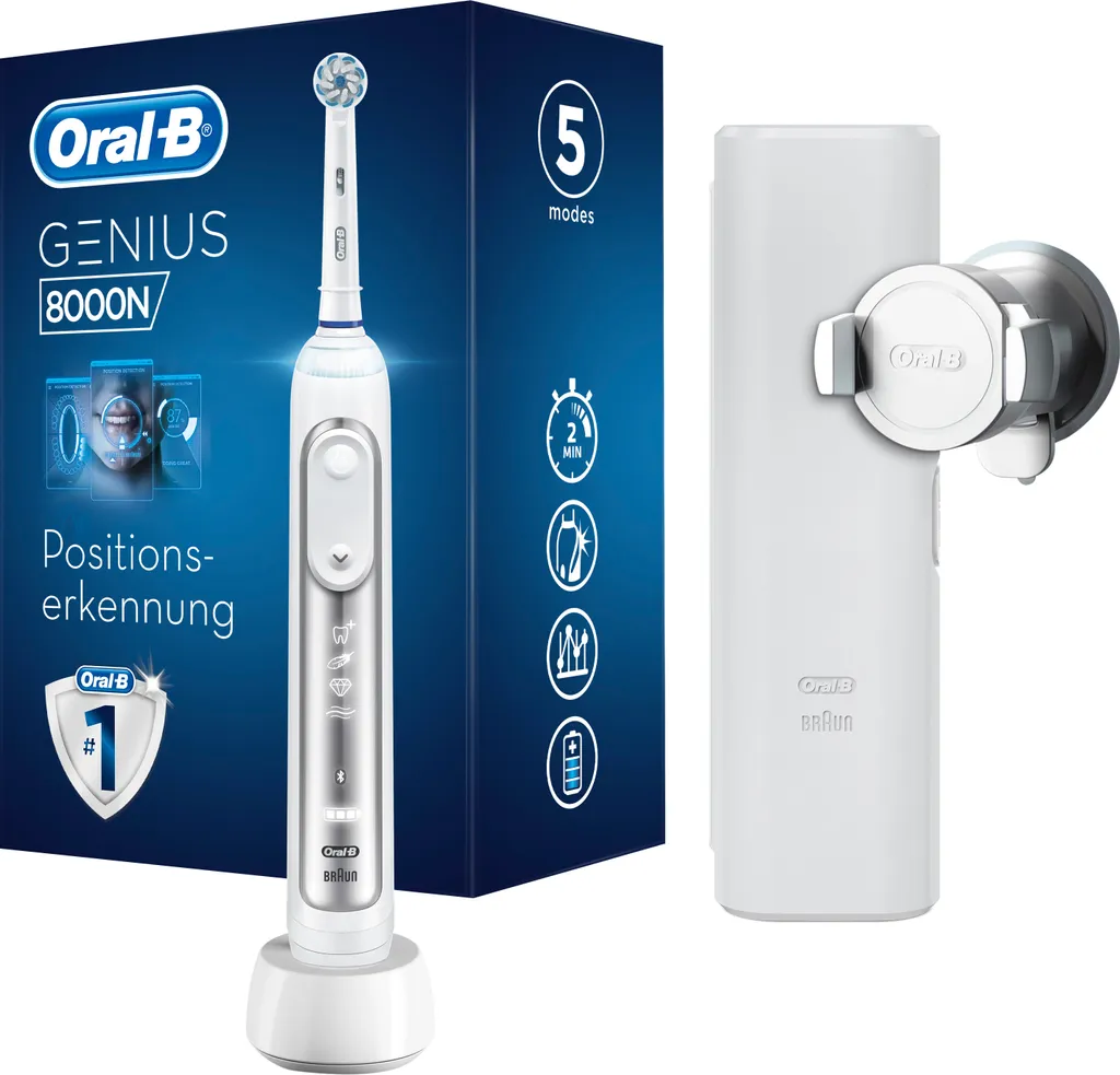 Die Oral-B Genius 8000N bietet ein intelligentes Putzsystem, das Ihnen hilft, so zu putzen, wie es Ihr Zahnarzt empfiehlt. Die einzigartige Positionserkennungstechnologie hilft Ihnen, alle Mundbereiche zu putzen, während der runde Bürstenkopf von Oral-B den Rest erledigt. Er entfernt bis zu 100% mehr Plaque als eine herkömmliche Handzahnbürste und sorgt ab dem 1. Tag für gesünderes Zahnfleisch und ein weißeres Lächeln durch die Entfernung von Oberflächenverfärbungen. Zusätzlich hilft Ihnen die Zahnbürste mit dem personalisierbaren SmartRing und der visuellen Andruckkontrolle, Ihr empfindliches Zahnfleisch zu schützen. Mit der Oral-B Genius 8000N können Sie beim Putzen nichts falsch machen. Kein Wunder, dass Oral-B die Zahnbürstenmarke Nr. 1 ist, die Zahnärzte weltweit am häufigsten empfehlen.Die wiederaufladbare elektrische Zahnbürste Oral-B Genius 8000N lässt sich mit den folgenden Aufsteckbürsten von Oral-B verwenden: CrossAction, 3DWhite, Sensi UltraThin, Sensitive, Precision Clean, Tiefenreinigung, TriZone und Ortho Care.