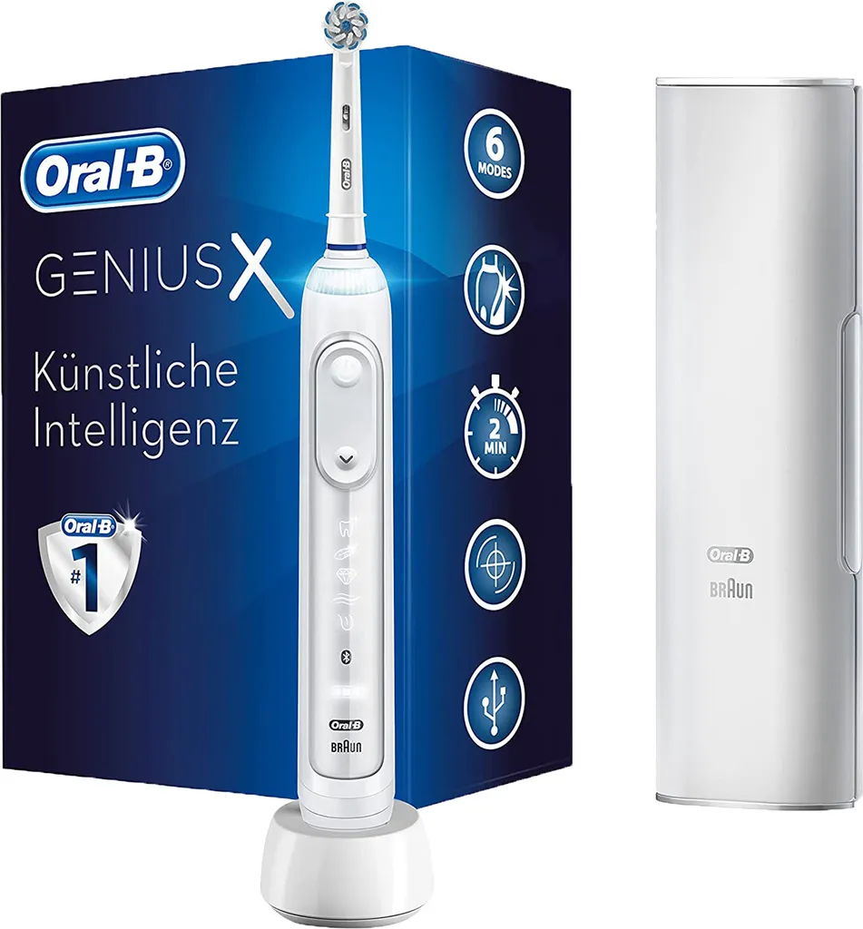 Oral-B Genius X 20000N Elektrische Zahnbürste/Electric Toothbrush, 6 Putzmodi für Zahnpflege, künstliche Intelligenz und Bluetooth-App, Lade-Reiseetui, Designed by Braun, weiß inkl. 4 Aufsteckbürsten/ White Box