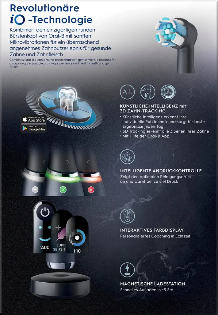 Die neue Oral-B iO übertrifft alle Erwartungen einer Zahnbürste mit unvorstellbarer Reinigungsleistung und einem sensationellen Mundgefühl. Das innovative, magnetische Antriebssystem der Oral-B iO liefert Energie punktgenau an die Borstenspitzen, die mit sanften Mikrovibrationen von Zahn zu Zahn gleiten, um ein effektives und angenehmes Putzerlebnis zu erzielen. Genieße jeden Tag ein frisches Gefühl wie vom Zahnarzt!