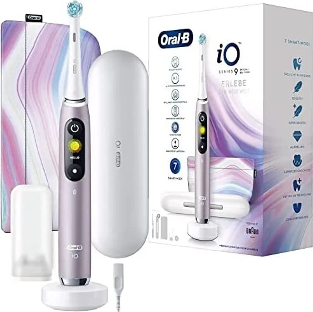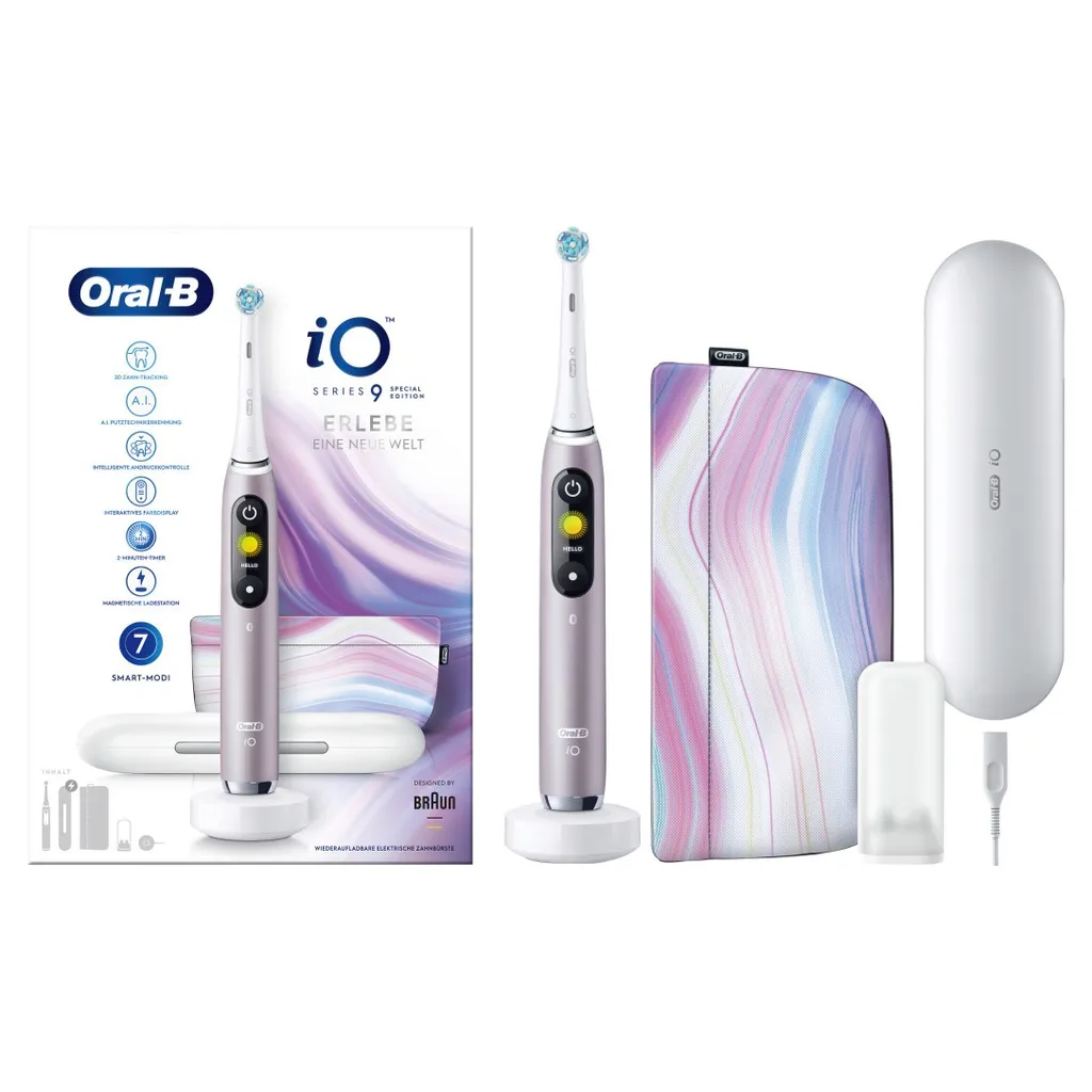 Lieferumfang: iO 9 elektrische Zahnbürste mit Aufsteckbürste Ultimative Reinigung, Lade-Reiseetui, magnetische Ladestation, Mini-Etui für Aufsteckbürsten, magnetische Aufbewahrungstasche