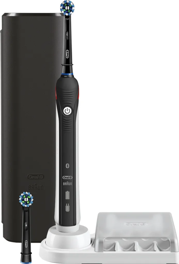 - Lieferumfang: 1 Handstück in Schwarz, Ladestation, 2 CrossAction Aufsteckbürsten in Schwarz, 1 Reise-Etui in Schwarz
