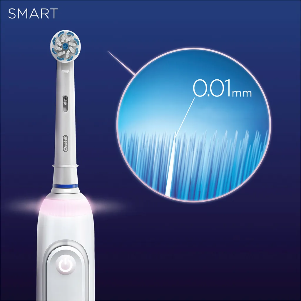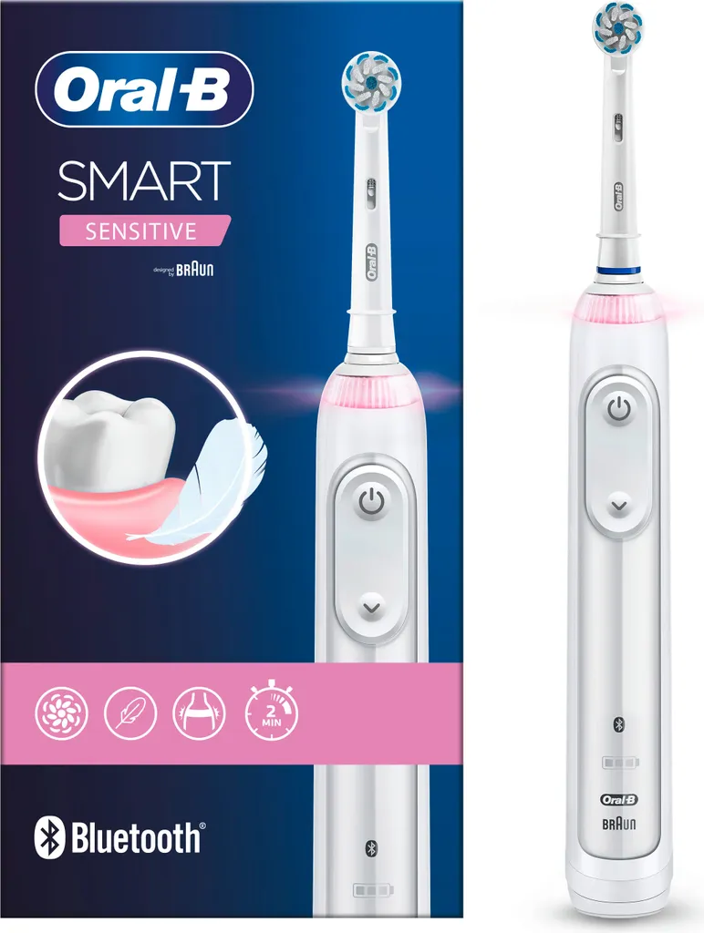 Die Oral-B Smart Sensitive elektrische Zahnbürste wurde speziell für Menschen mit empfindlichen Zähnen entwickelt. Das Sensitiv-Programm schützt zusammen mit der visuellen Andruckkontrolle Ihr sensibles Zahnfleisch und sorgt mit dem Sensitive Clean Bürstenkopf für eine besonders sanfte Reinigung. Die ultra-dünnen Borsten sind stark gegen Plaque und sanft zum Zahnfleisch. Wenn Sie die Zahnbürste mit der Oral-B App verbinden, erhalten Sie außerdem personalisiertes Coaching in Echtzeit, um so Ihr Zahnputzverhalten zu verbessern. Der integrierte Timer erinnert Sie an die von Zahnärzten empfohlene Putzzeit von 2 Minuten und der Lithium-Ionen Akku hält mit einer Aufladung mehr als 2 Wochen.