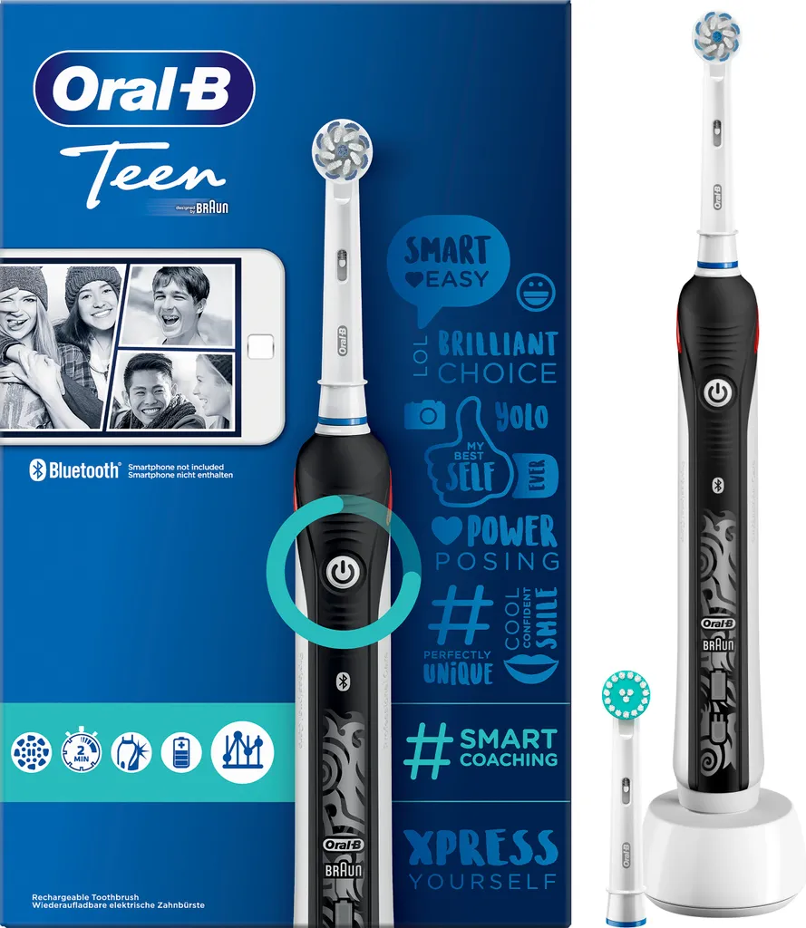 Erleben Sie die Oral-B Teen, von der Marke, die die erste wiederaufladbare Zahnbürste mit Bluetooth-Verbindung entwickelt hat. Die Zahnbürste ist ideal für Teenager ab 12 Jahren und unterstützt mithilfe der Ortho Care Aufsteckbürste die Zahnreinigung bei festsitzenden Zahnspangen. Das Handstück der Teen elektrischen Zahnbürste verbessert Ihre Putzgewohnheiten und verbindet sich mit der Oral-B App, um Ihnen Echtzeit-Feedback für bessere Putzergebnisse zu geben. Während Sie Ihre Putzroutine verbessern, erledigt der einzigartige, runde Bürstenkopf von Oral-B den Rest. Er entfernt bis zu 100% mehr Plaque als eine herkömmliche Handzahnbürste, sorgt so für gesünderes Zahnfleisch und hellt Ihr Lächeln ab dem ersten Tag der Anwendung durch das Entfernen von Oberflächenverfärbungen auf. Die Zahnbürste hilft Ihnen zusätzlich mit der visuellen Andruckkontrolle, Ihr empfindliches Zahnfleisch zu schützen. Das SmartCoaching der Oral-B Teen verbessert Ihre Putzgewohnheiten und Ihre Mundgesundheit. Kein Wunder, dass Oral-B die Zahnbürstenmarke Nr. 1 ist, die Zahnärzte weltweit am häufigsten empfehlen. Im Lieferumfang enthalten: 1 Teen wiederaufladbares Handstück in Schwarz, 1 Ladestation, 1 Ortho Care Aufsteckbürste für Zahnspangen, 1 Sensi UltraThin Aufsteckbürste für eine besonders sanfte Reinigung.Die wiederaufladbare elektrische Zahnbürste Oral-B Teen lässt sich mit den folgenden Aufsteckbürsten von Oral-B verwenden: CrossAction, 3DWhite, Sensi UltraThin, Sensitive, Precision Clean, Tiefenreinigung, TriZone, Ortho Care.